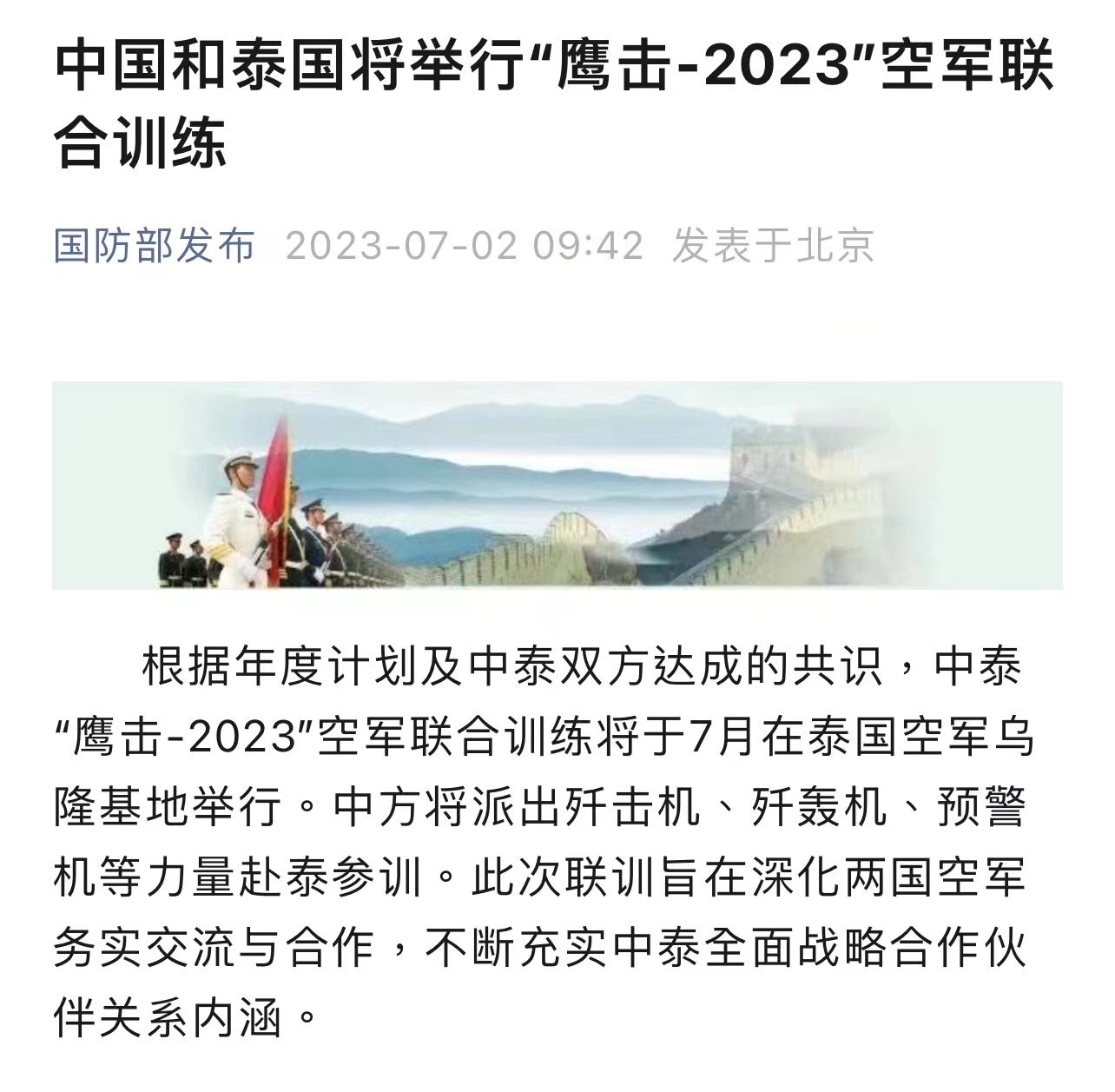 據國防部公布,中國將會與泰國舉行空軍聯合訓練。國防部表示,根據年度計劃及中泰雙方達成的共識,中泰「鷹擊-2023」空軍聯合訓練將於本月在泰國空軍烏隆基地舉行,中方將會派出殲擊機、殲轟機、預警機等參訓。