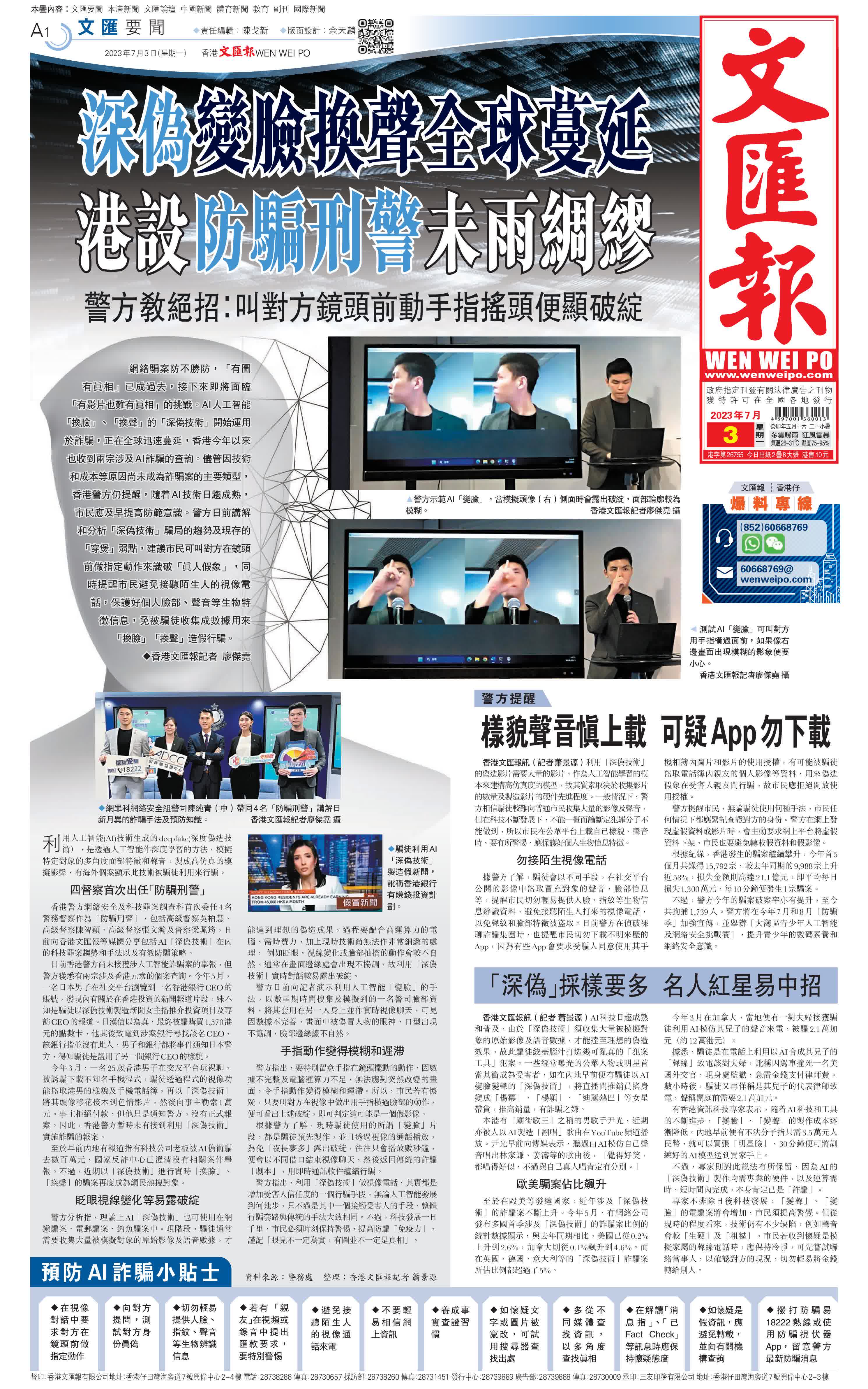 香港警方網絡安全及科技罪案調查科首次委任4名警務督察作為「防騙刑警」,包括高級督察吳柏慧、高級督察陳智穎、高級督察張文瀚及督察梁珮筠,日前向香港文匯報等媒體分享包括AI「深偽技術」在內的科技罪案趨勢和手法以及有效防騙策略。