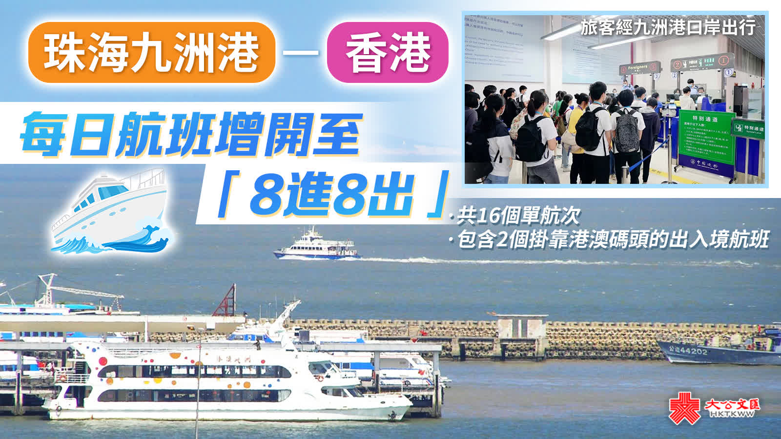 (大公文匯網記者 方俊明)「珠海九洲港-香港」出入境航班增開!記者今天(3日)從九洲出入境邊防檢查站獲悉,珠海九洲港口岸香港航線航班在原先每日「6進6出」基礎上,目前增開至每日「8進8出」,共16個單航次,其中包含2個掛港航班,進一步便捷旅客往返香港與珠江西岸。