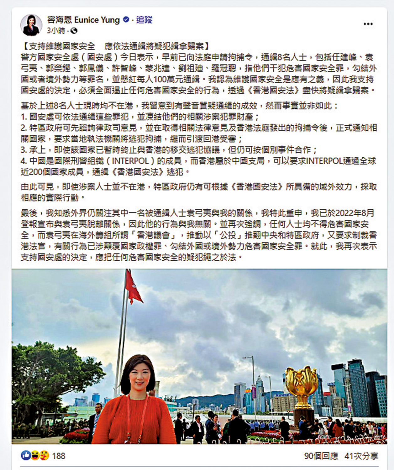 容海恩還表示,她已於2022年8月登報宣布與其中一位通緝犯袁弓夷脫離關係,因此其行為與她無關。