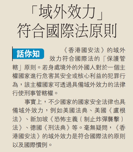 至於域外管轄權,譚惠珠表示,同樣需要涉事者如在2020年6月30日繼續干犯才能適用,世界上很多普通法國家有權力追究域外危害本國行為的人,因此完全符合國安法要求。