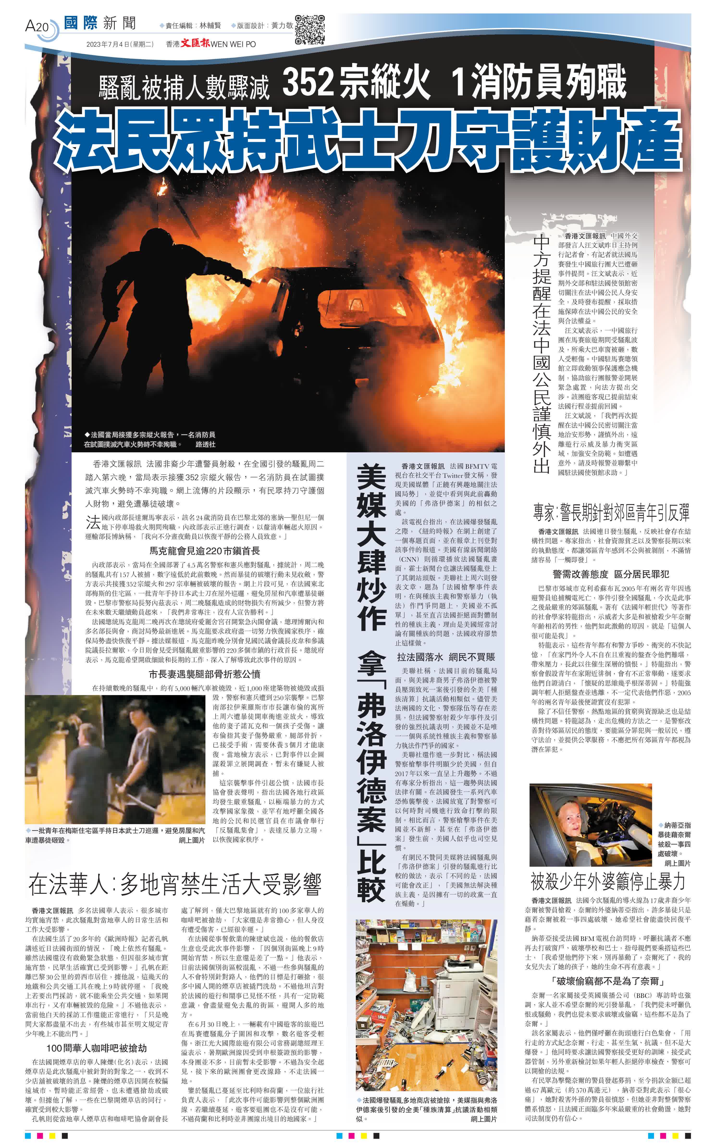 香港文匯報,法國非裔少年遭警員射殺,在全國引發的騷亂周二踏入第六晚,當局表示接獲352宗縱火報告,一名消防員在試圖撲滅汽車火勢時不幸殉職。網上流傳的片段顯示,有民眾持刀守護個人財物,避免遭暴徒破壞。