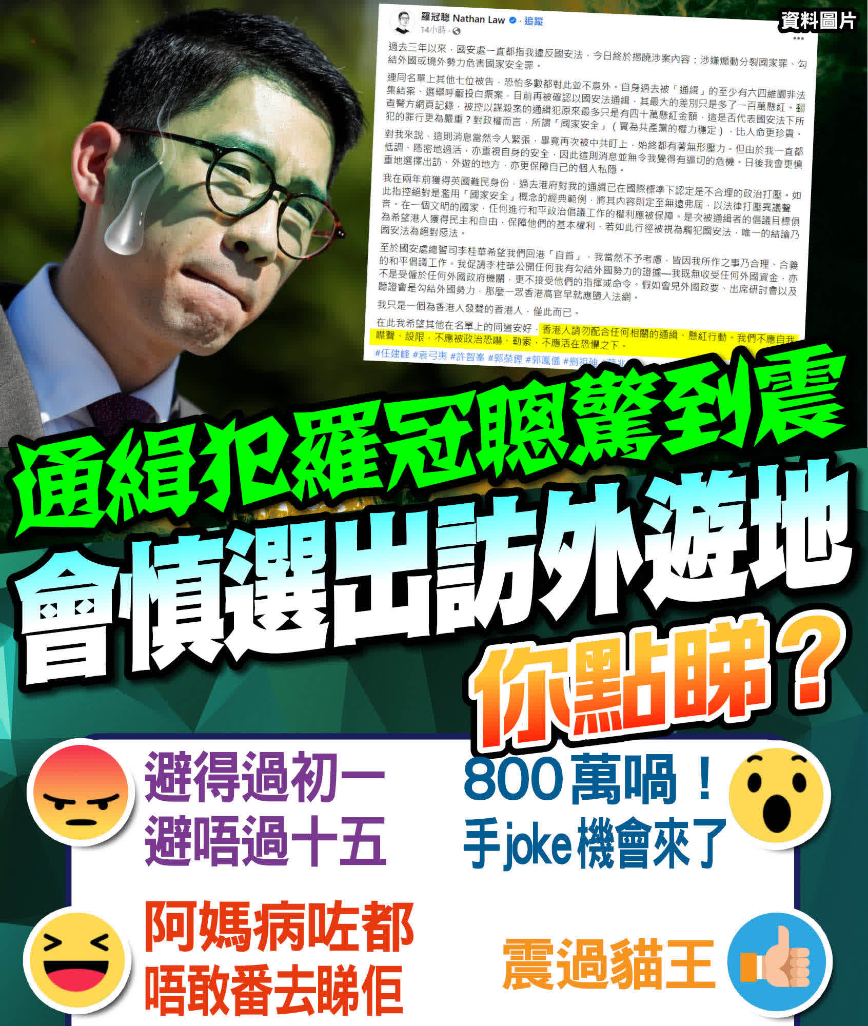 大公文匯全媒體報道,警務處國家安全處昨日宣布通緝8名涉嫌干犯香港國安法的人員,包括任建峰、袁弓夷、郭鳳儀、郭榮鏗、許智峯、羅冠聰等人,並各懸紅100萬港元。其中,自恃獲英國政治庇護的羅冠聰,聲言不會考慮回港自首,惟自知「身有屎」所以日後會更慎重地選擇出訪、外遊的地方喎。