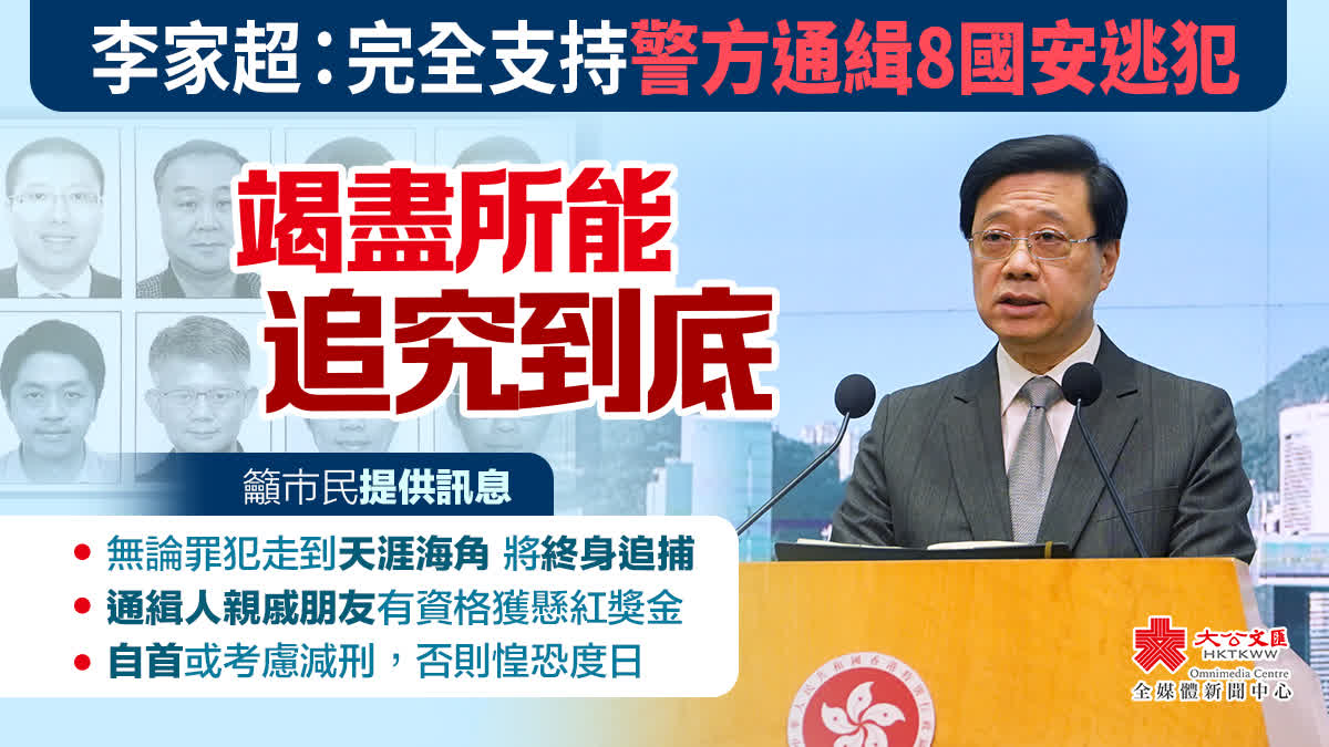 (大公報記者 趙明新)警方國安處前日(3日)公布通緝八名竄逃海外的亂港分子。行政長官李家超昨日會見傳媒時表示,完全支持並贊成警方的行動,強調危害國家安全屬嚴重罪行,特區政府會用盡一切合法手段終身追究被通緝者的法律責任,勸喻他們盡快自首。他又呼籲任何公眾人士包括八人的親朋向警方提供資料。