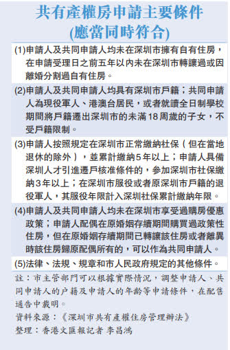 其中,最令港人關注的是,《辦法》第十二條規定:共同申請人為現役軍人、港澳台居民或者就讀全日制學校期間將戶籍遷出深圳市的未滿18周歲的子女,不受戶籍限制,因此港人可以參與購買;申請人按照規定在深圳市正常繳納社會保險(養老保險或者醫療保險,不含少兒醫療保險);申請人參加深圳市社會保險累計繳納五年以上,申請人具備深圳市人民政府規定的人才引進遷戶核准條件的,參加深圳市社會保險累計繳納3年以上;申請人及共同申請人均未在深圳市享受過購房優惠政策;申請人配偶在原婚姻存續期間購買過政策性住房,但在原婚姻存續期間已轉讓該住房或者離異時該住房歸原配偶所有的,可以作為共同申請人;申請人父母、申請人配偶父母在婚姻存續期間,單獨一方作為共同申請人的,雙方應當同時滿足深圳無住房和未在深圳享受過購房優惠政策的條件。