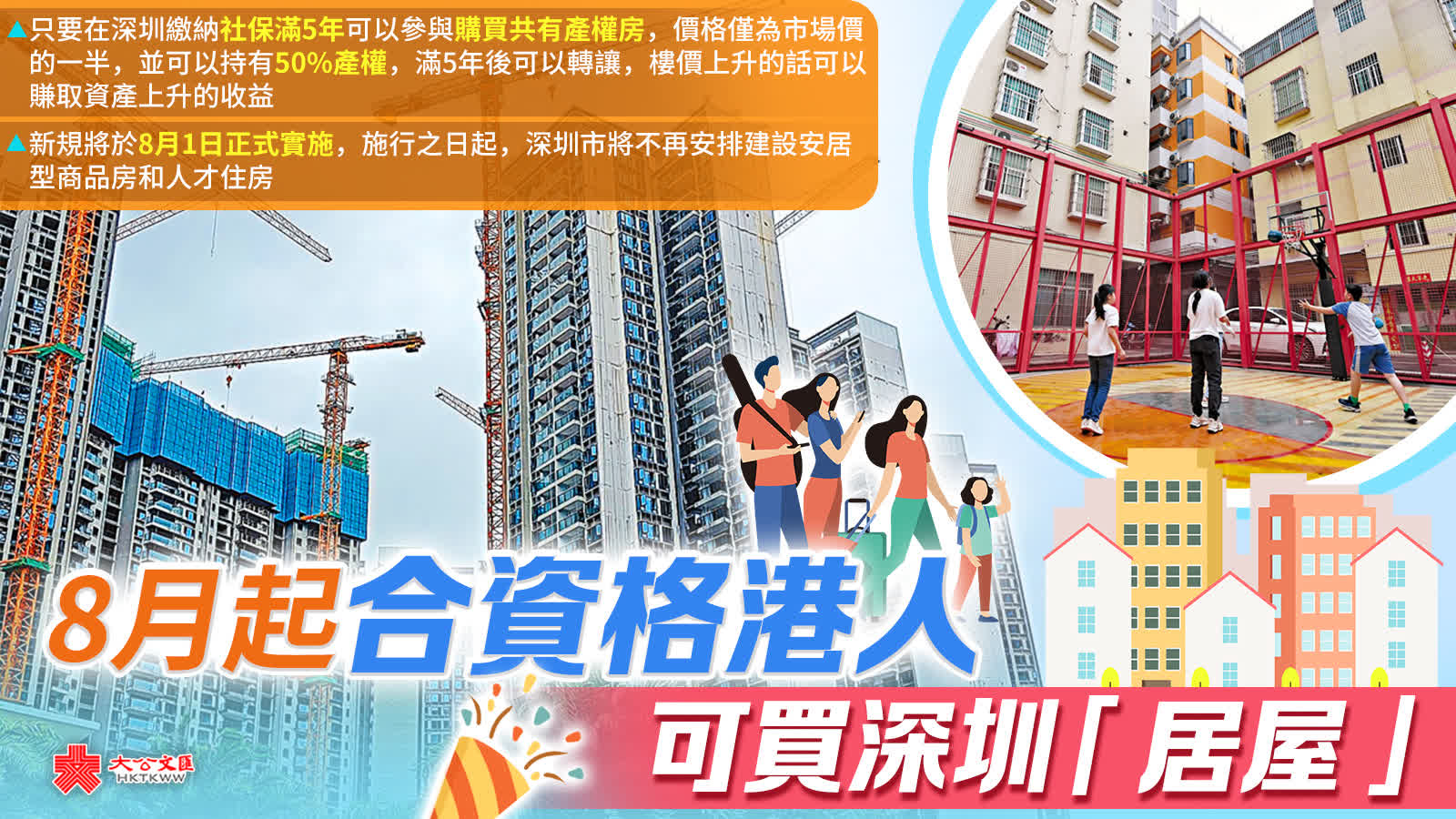 (香港文匯報記者李昌鴻 深圳報道)合資格的香港人可以在深圳購買共有產權房了!深圳市日前發布4份政府令,其中《深圳市共有產權住房管理辦法》(簡稱《辦法》)中提到,只要在深圳繳納社保滿5年也可以參與購買共有產權房,價格僅為市場價的一半,並可以持有50%產權,滿5年後可以轉讓,樓價上升的話可以賺取資產上升的收益,此即意味着,居住在深圳的港人,只要符合條件,也可以購買共有產權房。該新規將於8月1日正式實施,施行之日起,深圳市將不再安排建設安居型商品房和人才住房。