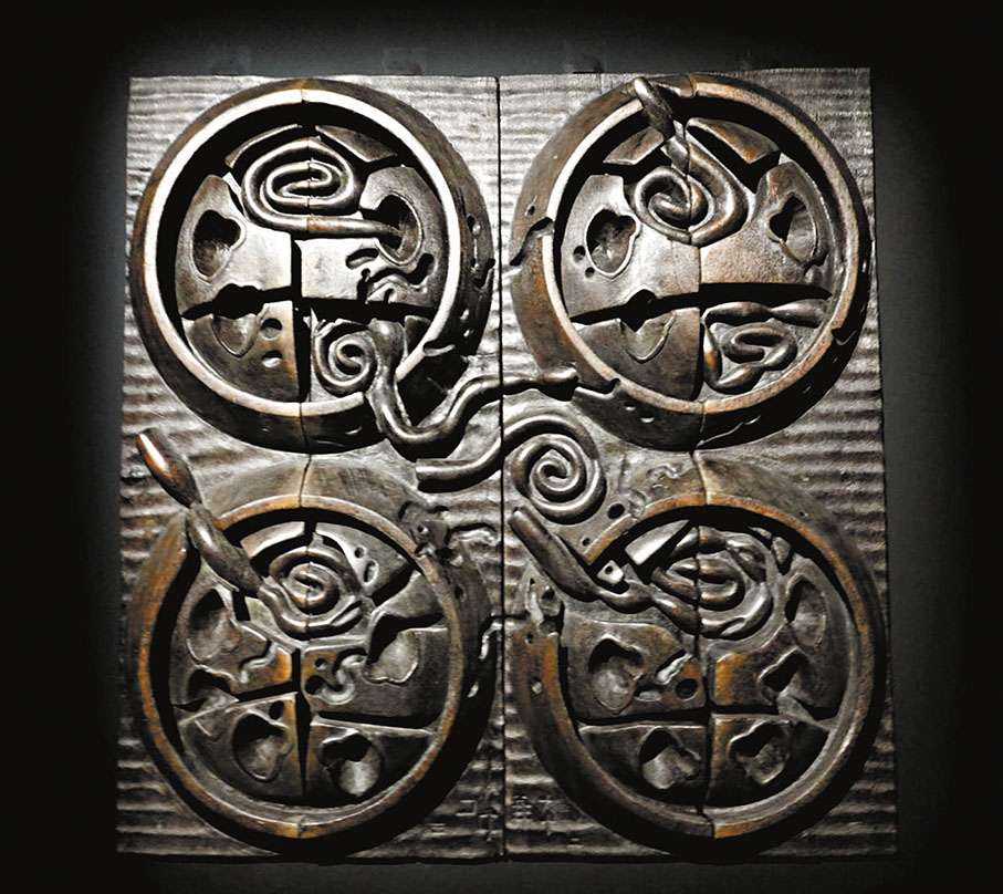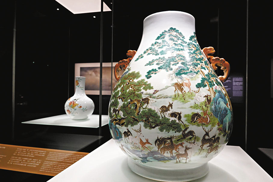 力臻完美展區的代表人物則是康熙皇帝,他所設立的清宮造辦處集結能工巧匠,為宮廷製作了大量臻於完美的藝術品及工藝品。今次展出的粉彩百祿圖大瓶所用粉彩技術,就是在當時始創。「這一區的青花器物,亦展示了康熙作為高瞻遠矚的『藝術總監』所引領創製出藝術品的精美,他的影響力延續後世,如乾隆時期的掐絲琺瑯藏品中也可以見到,那種力臻完美的工藝追求。」鄧慶燊說。該區配合以香港藝術家張義的《四宮》,作品以甲骨文、龜甲為靈感,配合西方幾何分割元素,展現抽象造型之美。