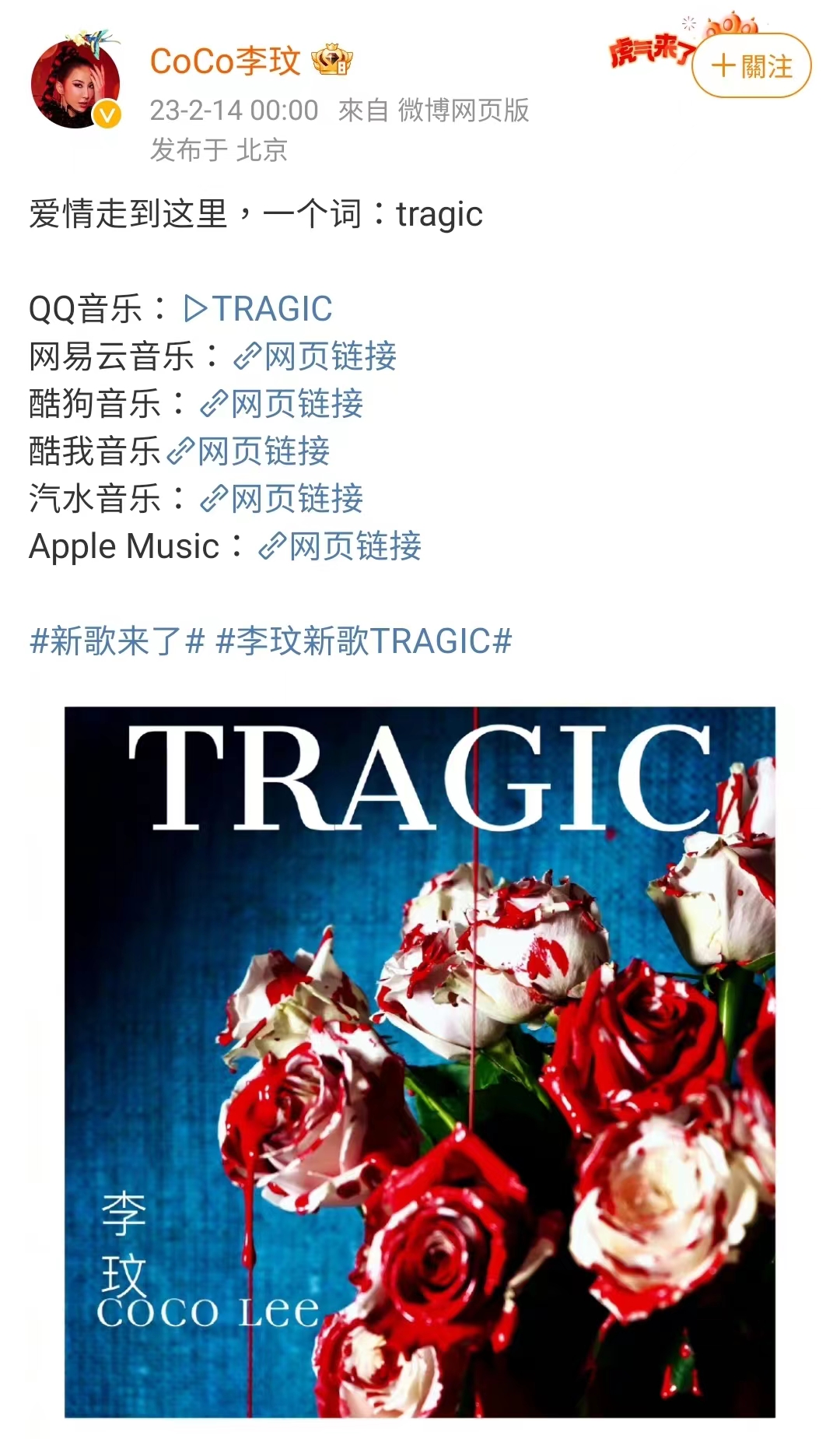 今年2月,李玟發表新歌《TRAGIC》,她在社交平台寫道:「當你在愛情遇到困境,希望這首歌可以給你力量和勇氣,去愛最珍貴的自己。」「愛情走到這裏,一個詞:TRAGIC。」「離開是最好的安排。」外界猜測,這也是李玫下定決心跟千瘡百孔的婚姻告別,給自己打氣。而Tragic一詞,本身就有極度哀痛、悲慘,在死亡中掙扎的意味。
