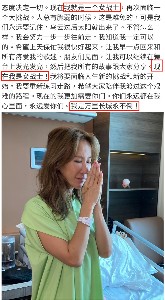 在文章中,李玟不止一次表示,「我就是一個女戰士」,「我會努力一步一步往前走」,「我是萬里長城永不倒」,「我也希望向大家傳達這份正能量」。