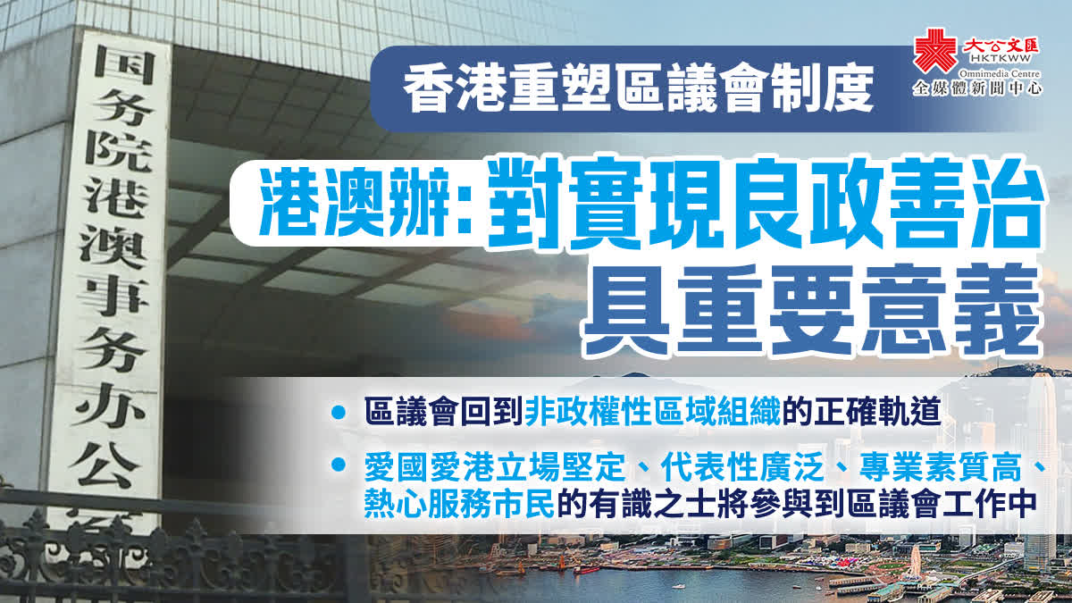 發言人最後表示,香港特區重塑區議會制度後,必將有一大批愛國愛港立場堅定、代表性廣泛、專業素質高、熱心服務市民的有識之士積極參與到區議會工作中,共同致力於特區的良政善治,香港構建符合自身實際的優質民主的道路定會越走越寬廣!