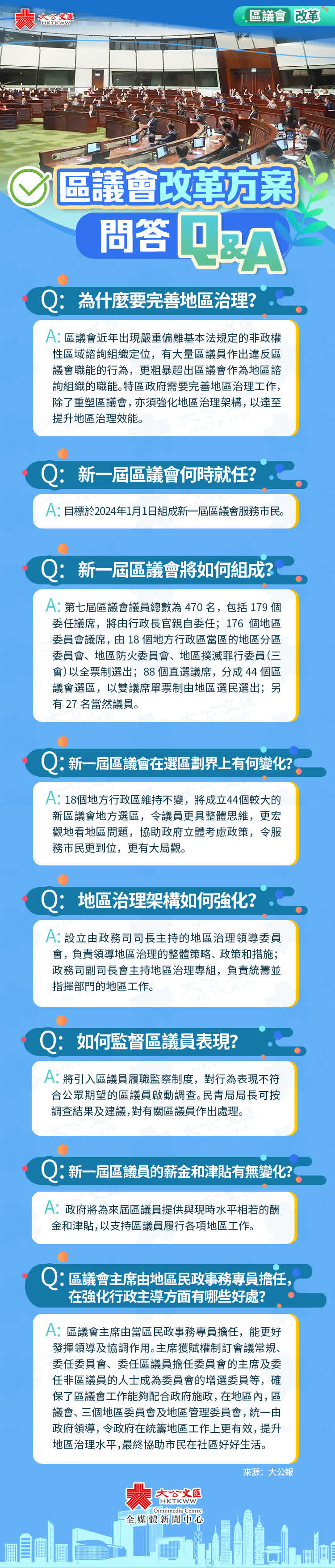 今年5月2日,特區政府公布完善地區治理建議方案,包括區議會要重回香港基本法第九十七條下非政權性諮詢組織的定位,使其去政治化;特區政府會優化區議會的諮詢和服務職能,以及重塑後的區議會將擔當配合特區政府的角色。