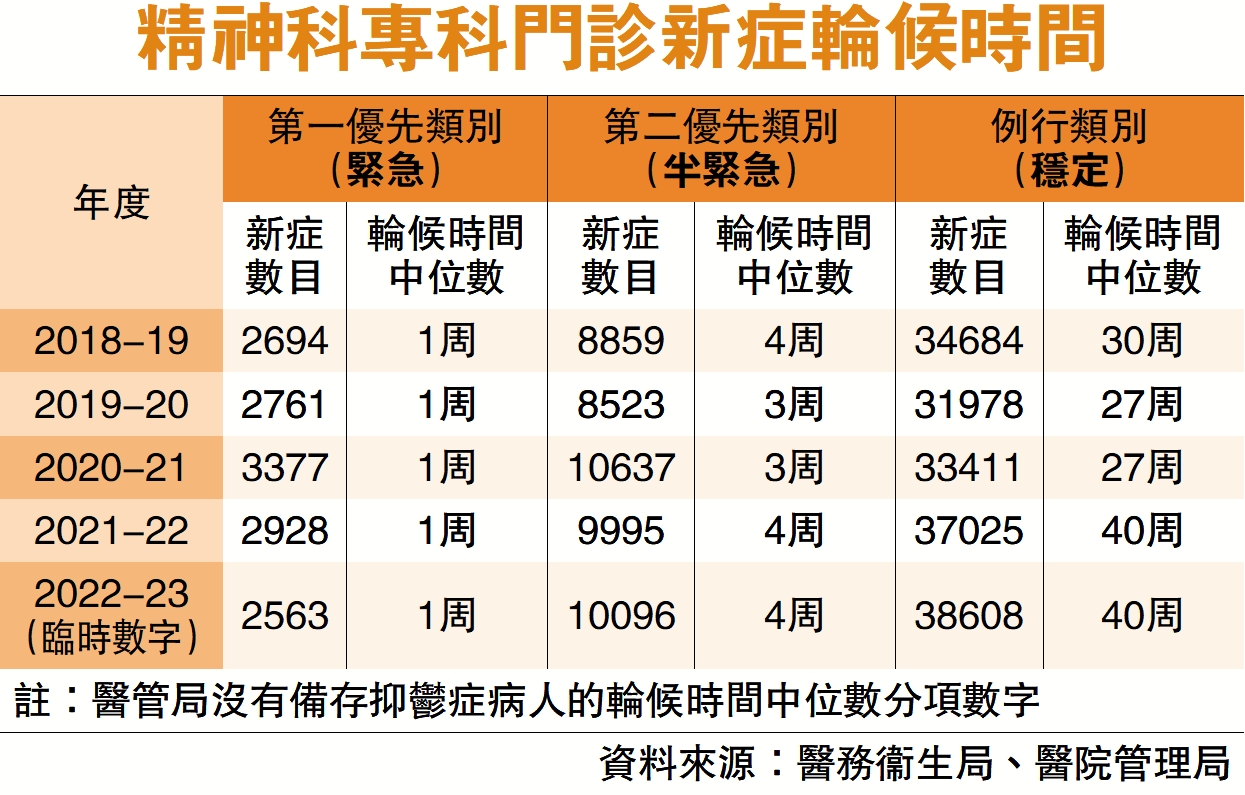 有社工表示,本港的精神科配套不足,輪候時間過長。公立醫院精神科往往需要輪候超過一年時間,令輕症者最後病情拖到更嚴重,認為政府要注意增加相應人手及資源。