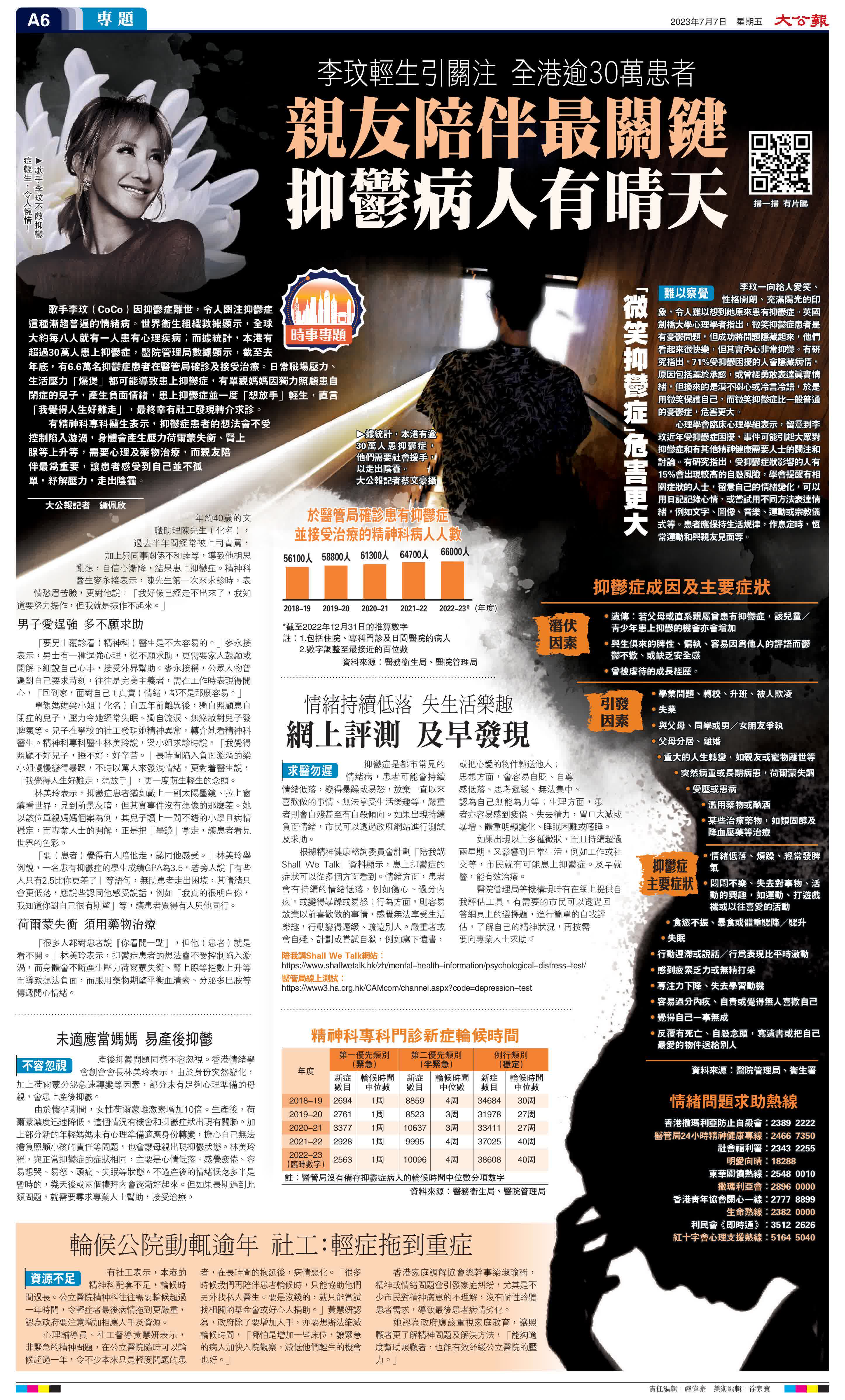 (大公報記者 鍾佩欣)歌手李玟(CoCo)因抑鬱症離世,令人關注抑鬱症這種漸趨普遍的情緒病。世界衞生組織數據顯示,全球大約每八人就有一人患有心理疾病;而據統計,本港有超過30萬人患上抑鬱症,醫院管理局數據顯示,截至去年底,有6.6萬名抑鬱症患者在醫管局確診及接受治療。日常職場壓力、生活壓力「爆煲」都可能導致患上抑鬱症,有單親媽媽因獨力照顧患自閉症的兒子,產生負面情緒,患上抑鬱症並一度「想放手」輕生,直言「我覺得人生好難走」,最終幸有社工發現轉介求診。