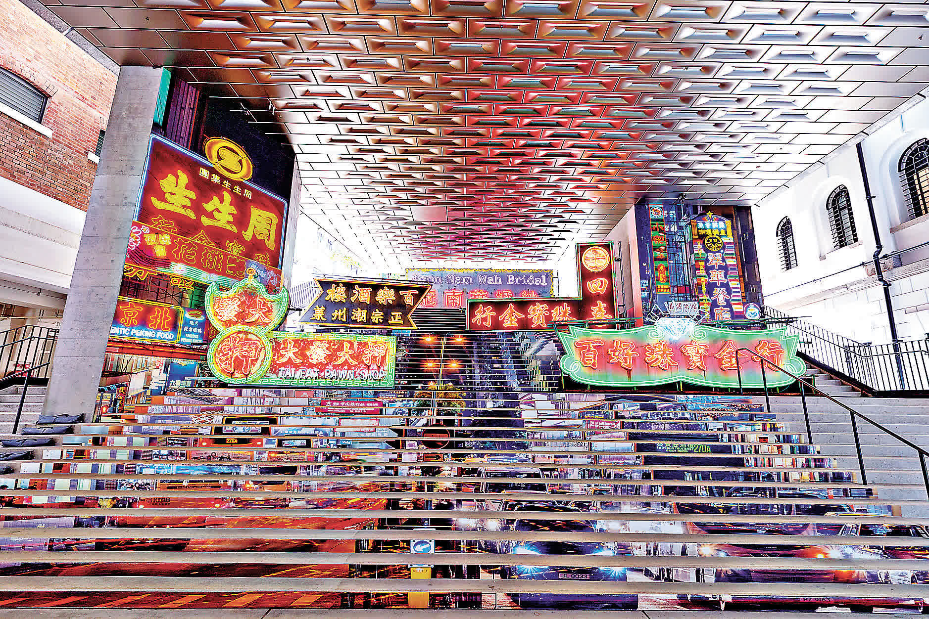 另一部分展區則位於洗衣場石階,這裏將變身成上世紀七八十年代的繁華街景,由五個舊有霓虹招牌包括「大發押」「百樂酒樓」「冠南華婚紗」及「秋田館形象圖」等,化作一片璀璨霓裳亮起燈火,讓觀眾如同重返上世紀的灣仔、尖沙咀和銅鑼灣等地,站於舊時九龍及香港島高樓林立的街角風景當中,重回昔日時光。