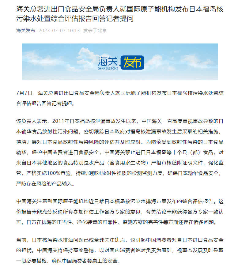 據海關總署官方微信公眾號消息,7月7日,海關總署進出口食品安全局負責人就國際原子能機構發布日本福島核污染水處置綜合評估報告回答記者提問。
