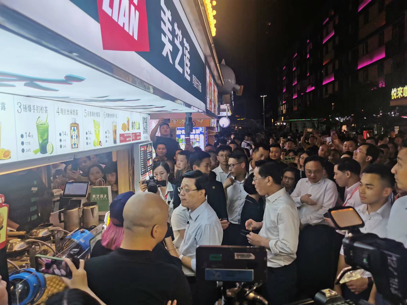 「美芝蓮」以港風港味的經營小品首先吸引李家超駐足。李家超一邊品嘗店家遞來的小吃,一邊詢問港味小吃在貴陽的發展情況,聽聞老闆言及勢頭良好,李家超高興地笑了。