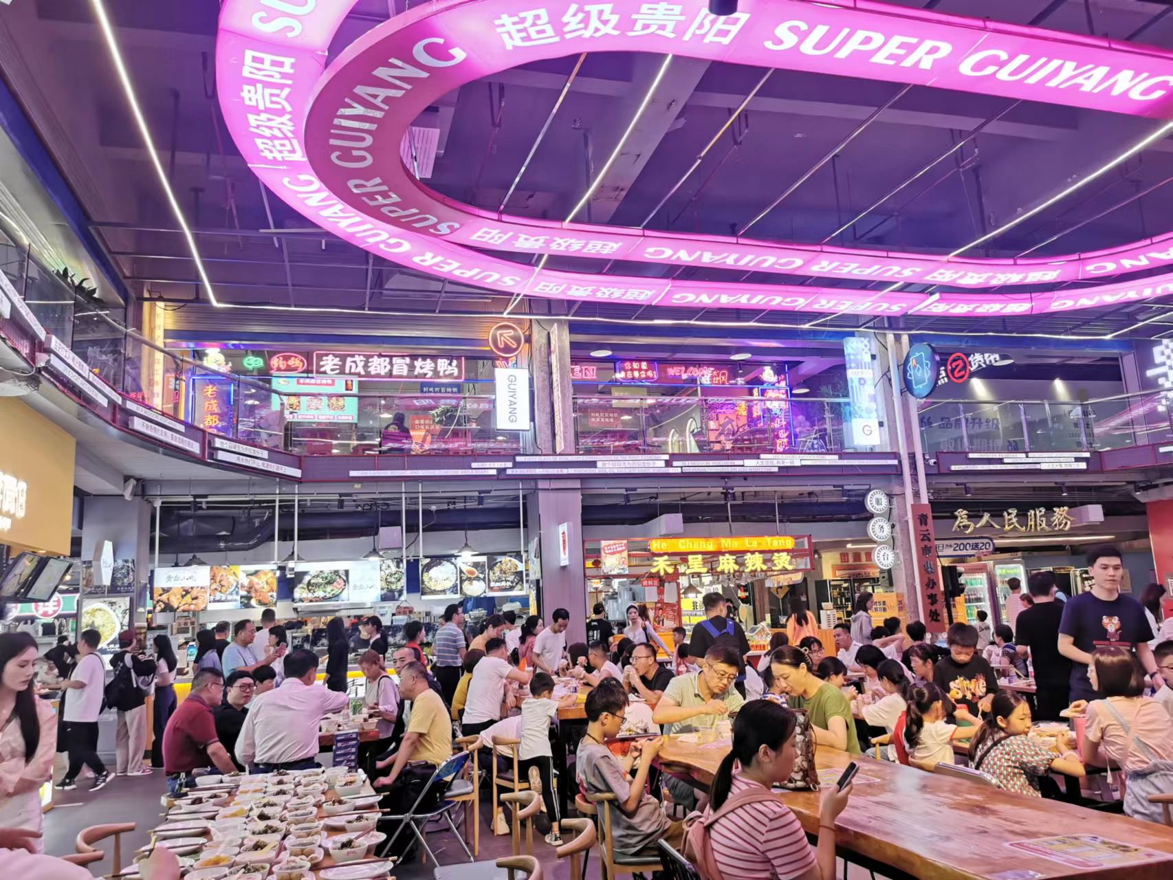 不知從什麼時候起,青雲路就有了「貴陽深夜食堂」這一名號。李家超一行在「青雲市集」潮玩的第三站,就是貓街右手邊的貴陽小吃不夜城。放眼望去,數千平米的美食大堂,各種店舖、攤檔令人眼花繚亂,但並不嘈雜,特首一行在主人預留的長桌兩邊依次落座,紅橋老六烤雞腿、青岩綠色米豆腐、清鎮熱湯絲娃娃、洋芋粑、水果豆花、湯圓等七、八種特色小吃,像變戲法式地擺上來。味道怎麼樣可能要慢慢回味,但主人的熱情和好客則首先給人留下深刻印象。