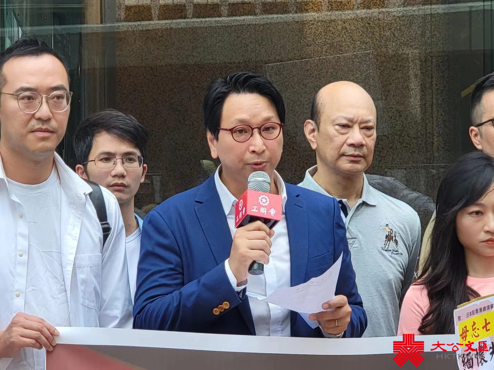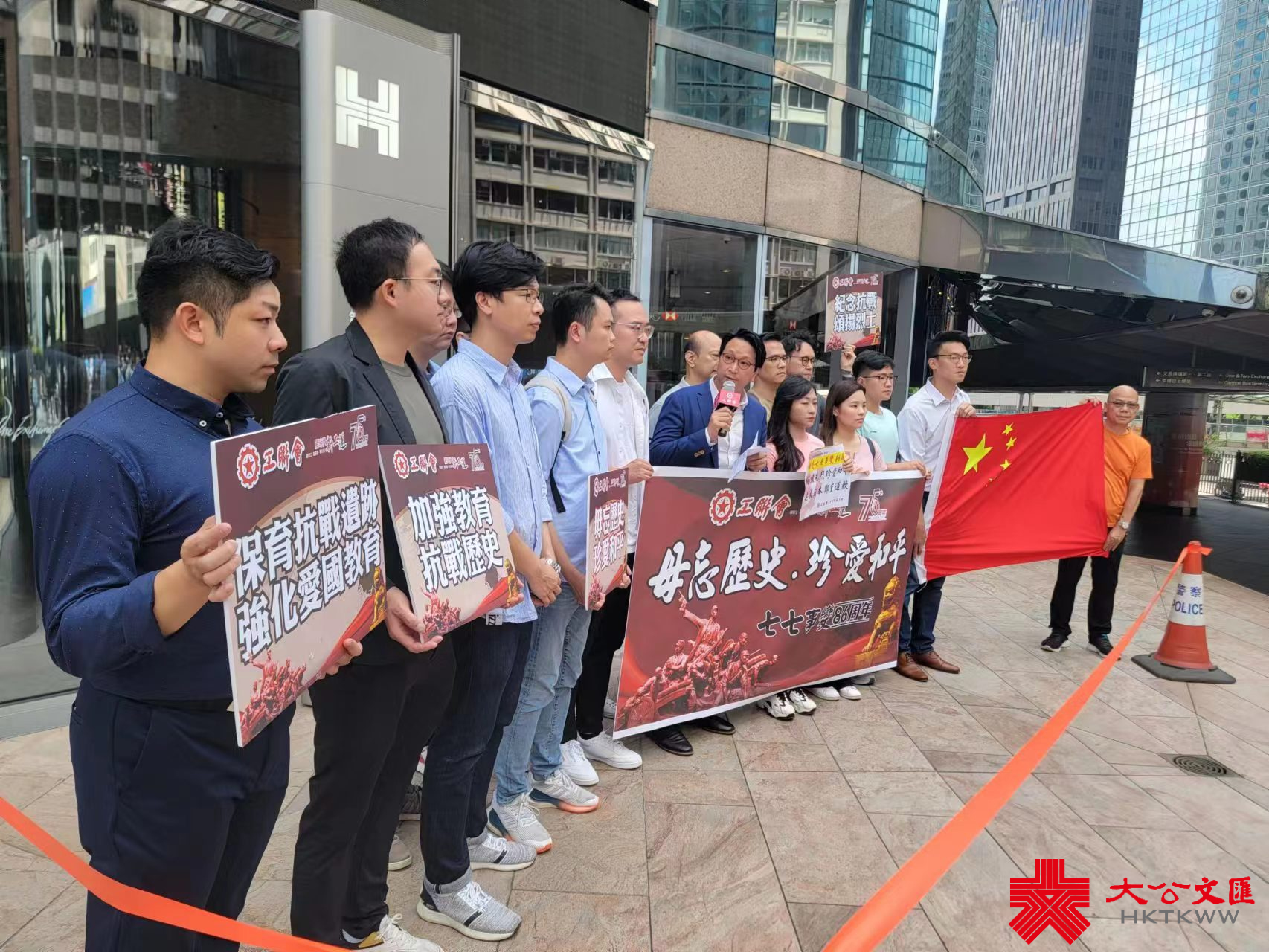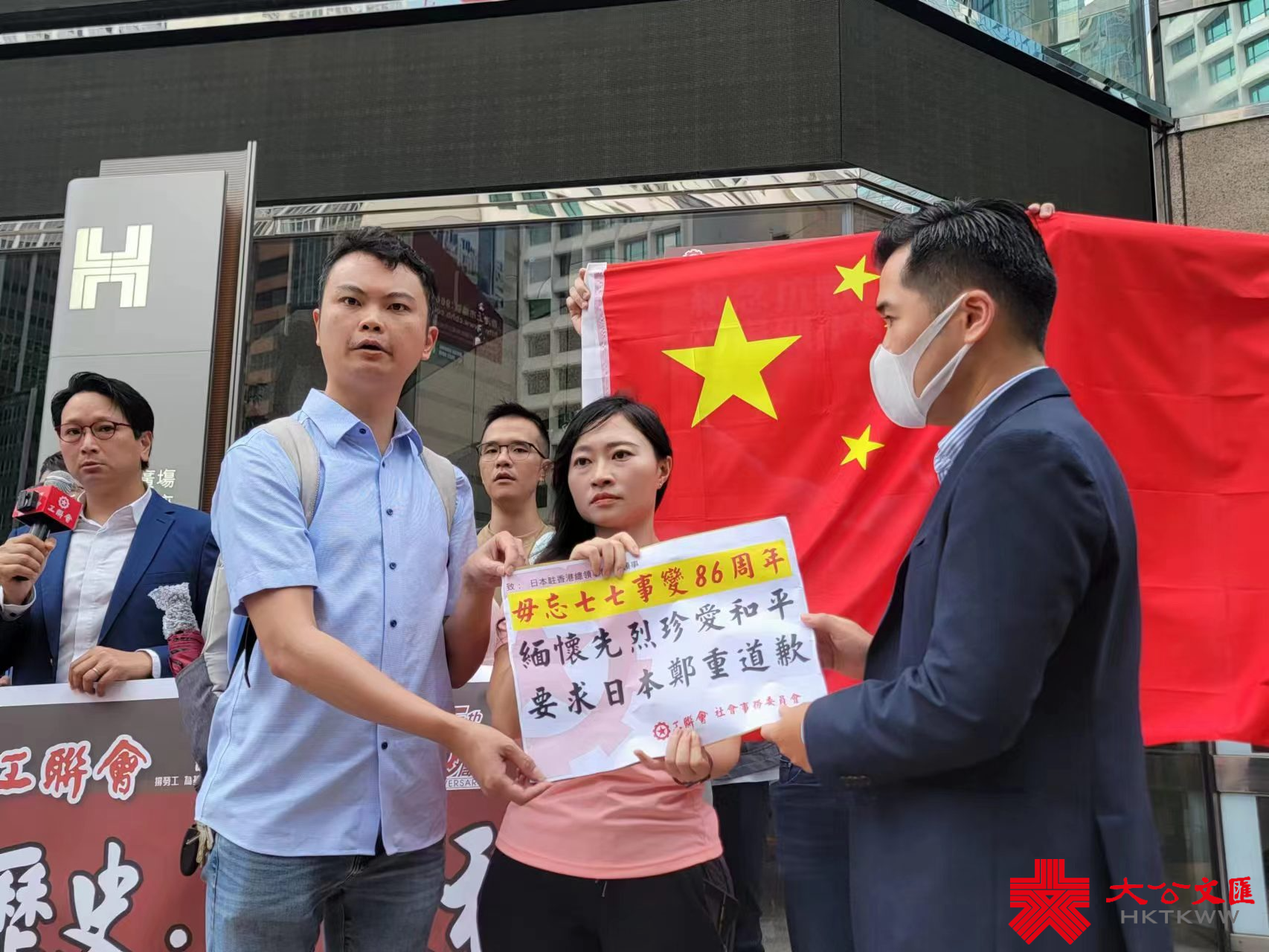 (大公文匯全媒體記者 馮沛賢)86年前的今日,「七七事變」爆發,日本帝國主義發動全面侵華戰爭,拉開了中華民族全面抗戰的序幕,亦成為中國人永遠沒法忘卻的日子。工聯會立法會議員鄧家彪、陳穎欣及工聯會社會事務委員會成員今日(7日)到日本駐香港總領事館請願,高呼「緬懷先烈 珍愛和平」、「要求日本鄭重道歉」等口號,又拉起橫額,呼籲市民銘記抗戰歷史,同時要求日本正視侵華史實及鄭重道歉。