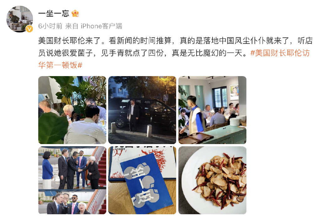 2023年7月6日下午,美國財政部部長珍妮特·耶倫乘機抵達北京。據微博網友及餐廳「一坐一忘」官方微博賬號發文,耶倫下飛機後第一餐選在了北京三裏屯的一家雲南菜館「一坐一忘」,餐廳方面發布的圖片顯示,耶倫一行人並未坐在包廂,而是坐在餐廳大堂中。