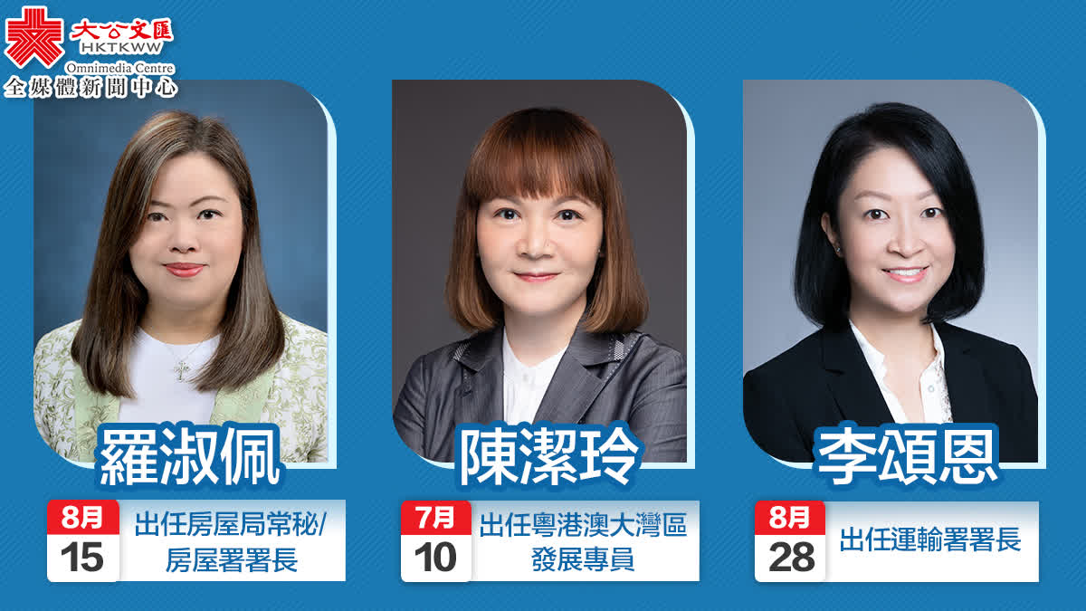 對於羅淑佩、陳潔玲及李頌恩的任命,公務員事務局局長楊何蓓茵表示,三位同事均為資深政務主任,具備出色領導和管理才能。有信心她們能在新崗位為市民提供專業高效的服務。