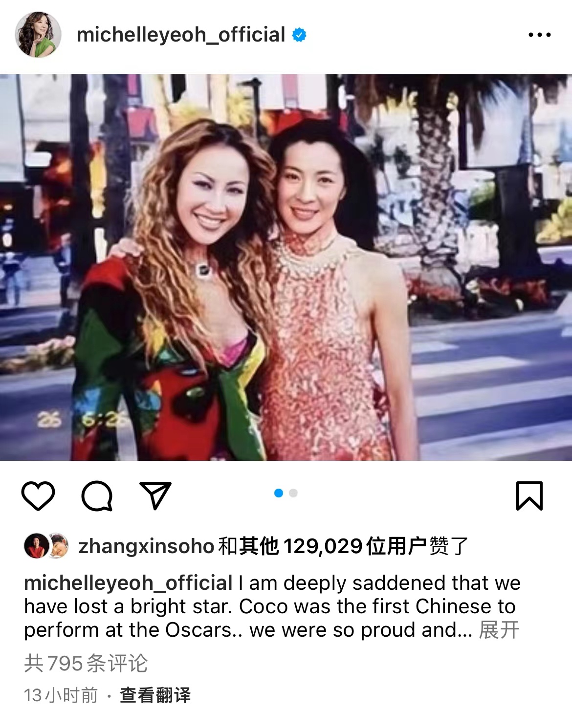 今日續有圈中人貼文悼念Coco,奧斯卡影后楊紫瓊今日上載二人合照及發文悼念,發文稱:「我深感悲痛,我們失去了一顆閃亮的星星。Coco是首位在奧斯卡頒獎典禮上表演的亞洲人……我們感到非常自豪,而且永遠都會。你和你美麗的聲音將被我們想念。親愛的,安息吧…衷心為Coco的家人和所有愛你的人獻上誠摯的慰問。」
