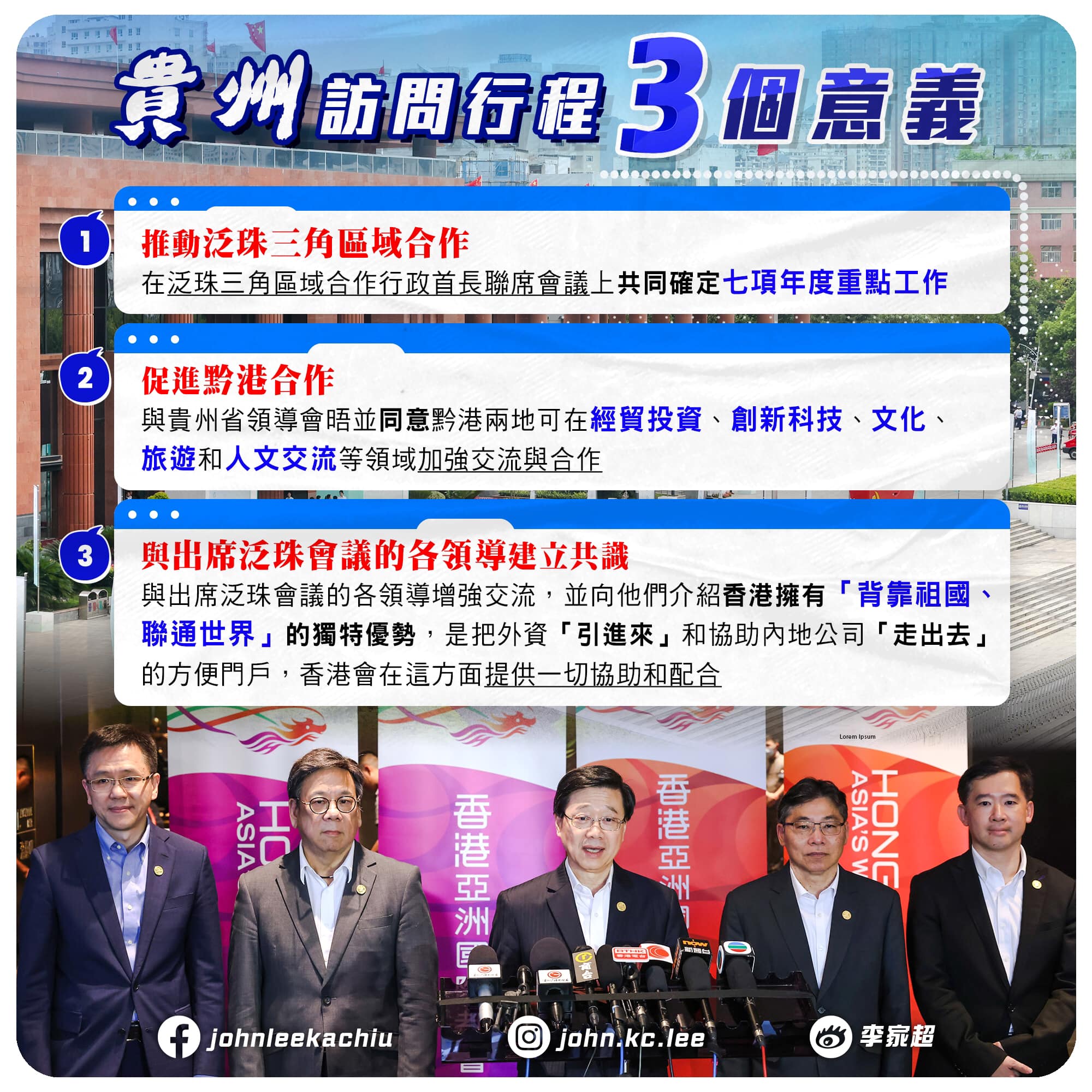 大公文匯全媒體報道,行政長官李家超本周到貴州出席「泛珠三角區域合作行政首長聯席會議」後,他今日(7日)傍晚總結貴州行程時表示,是次行程的三大意義:第一,推動泛珠三角區域合作;第二,促進黔港合作;第三,與出席泛珠三角區域合作行政首長聯席會議(泛珠會議)的各領導建立共識。