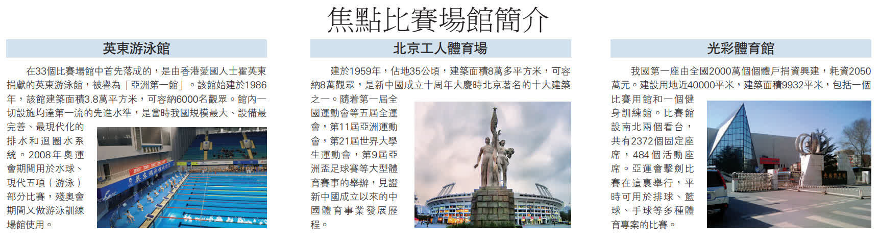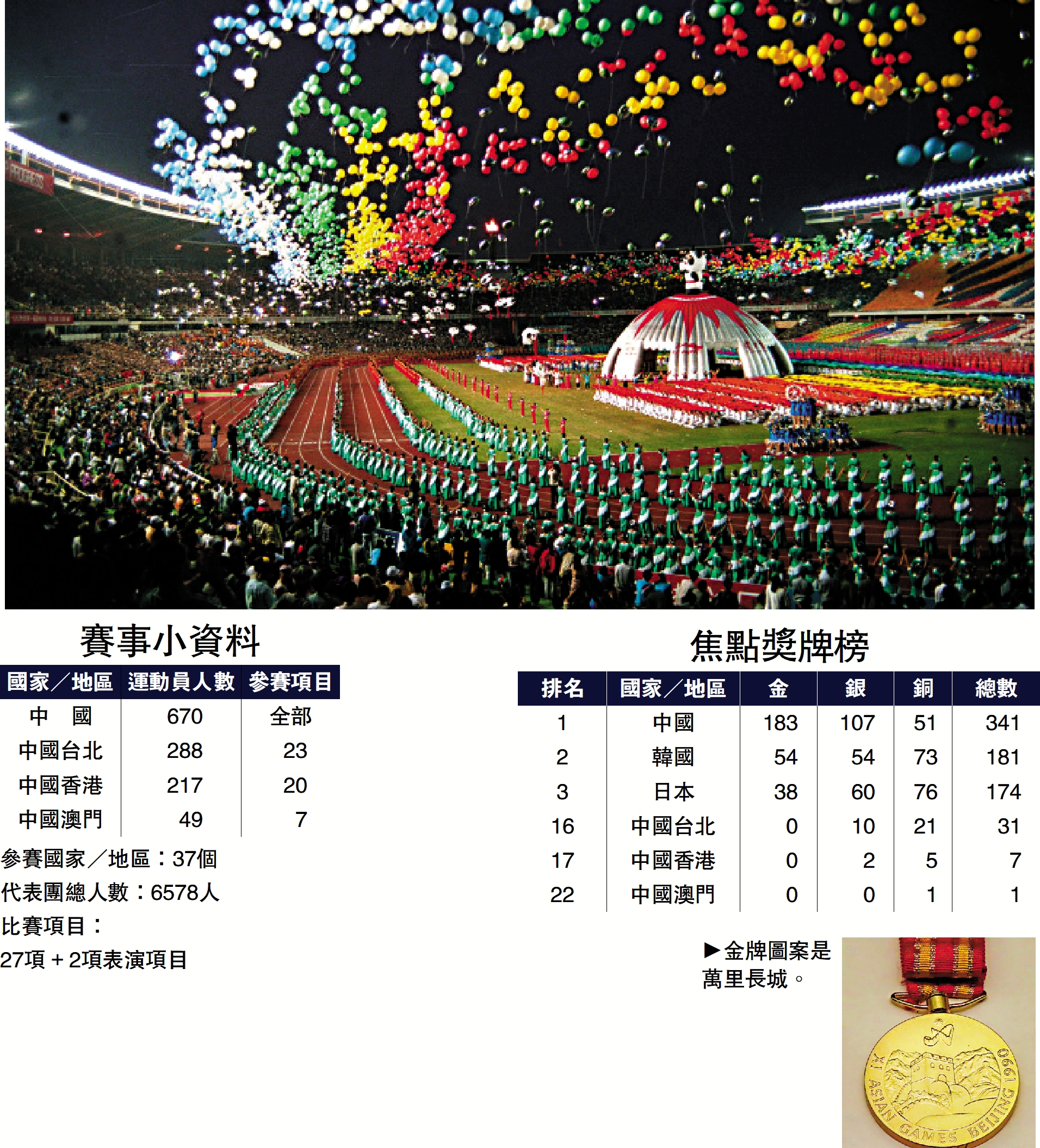(大公報 記者 任芳頡)1990年9月22日至10月7日,第十一屆亞運會在北京舉行。來自亞奧理事會成員的37個國家和地區的體育代表團共6578人參加。中國代表團636名運動員參加了全部27個項目和兩個表演項目,以金牌183枚,銀牌107枚,銅牌51枚高踞金牌榜和獎牌榜首位。北京亞運是中國首次舉辦大型綜合性國際體育賽事,作為中國體育事業開新篇的序章,同時也是改革開放後中國擴大對外交流,讓北京逐步成為國際大都會的契機。