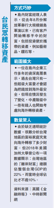 一名台灣家族辦公室的高級主管說,台海緊張情勢,已提醒更多人思考管理資金的新方式。「過去只有特別有錢的富豪認為,把錢放在海外會比較安全。現在連中產階級也在談論這些問題。」