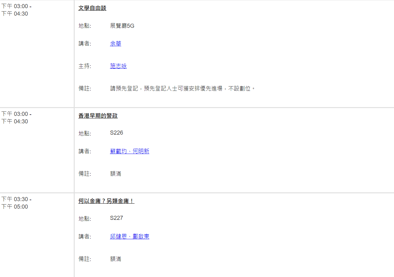 據書展網站9日顯示,7月19日許知遠主講的「全球旅行者梁啟超」,最新地點為S221;7月22日余華主講的「文學自由談」,最新地點為展覽廳5G;7月24日沈西城主講的「我經歷的香港電影輝煌時代」,最新地點為S421。