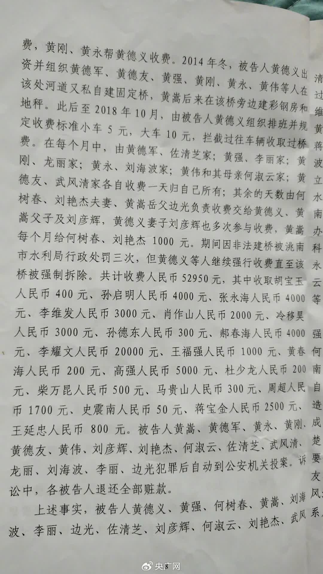 「我哥、侄兒十幾口人都參與建橋了,本來就是自發的,沒工錢,我也給不了工錢,就收過路車點錢,但是不強制,你願意給就給,不給也讓過。」黃德義否認了判決書上的「共收取過路、過橋費52950元」的說法。