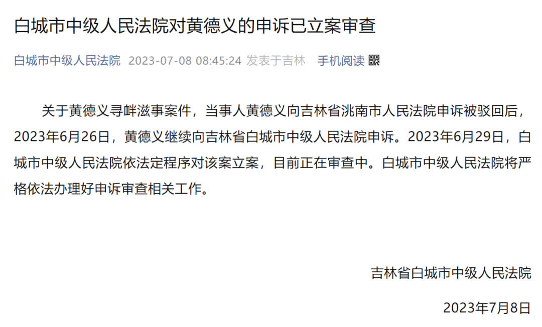 2021年底,黃德義提出申訴。今年3月31日,申訴被洮南市人民法院駁回。