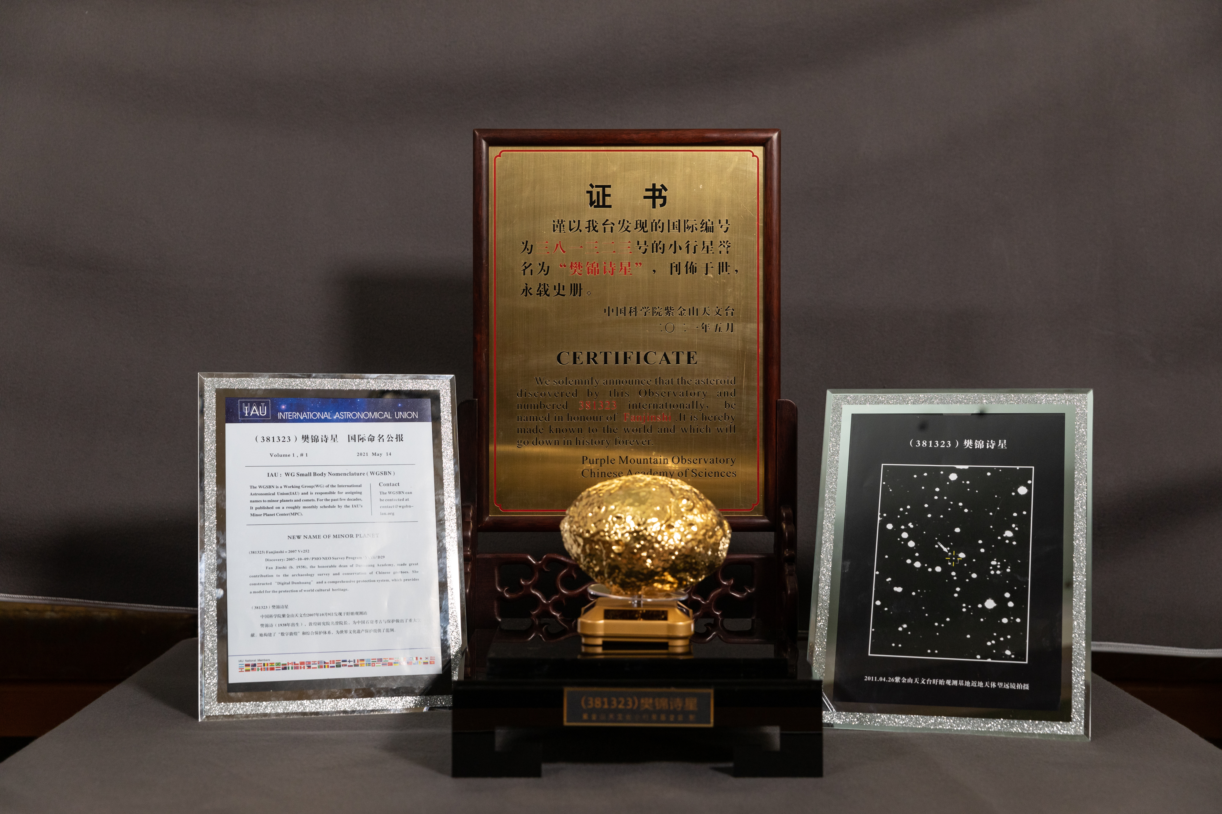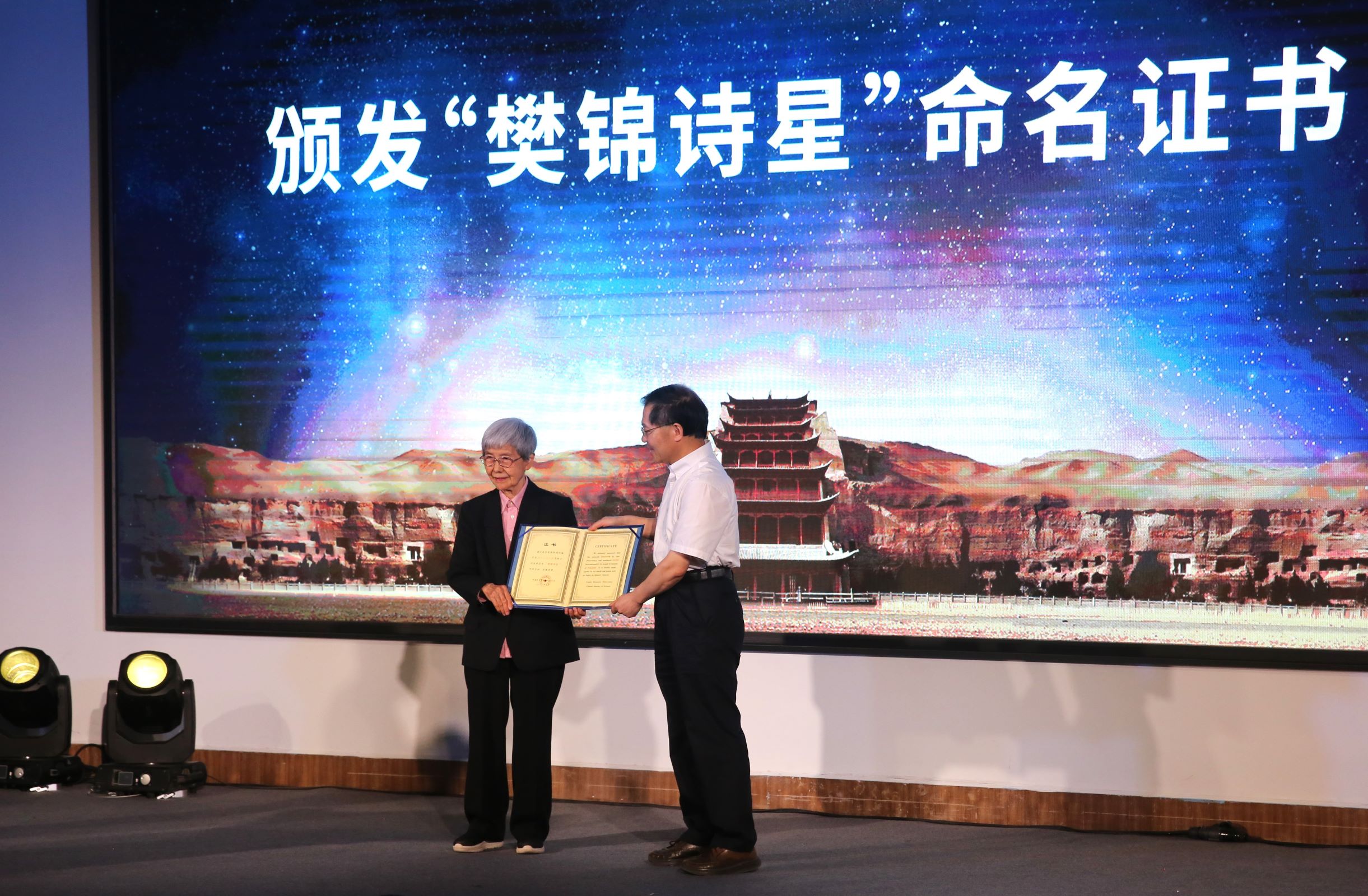 (大公文匯網記者郭濤敦煌報道)擇一事,終一生;心歸處,是敦煌。10日,甘肅省人民政府、國家文物局、中央文史研究館、何梁何利基金會、中科院紫金山天文台在敦煌研究院共同舉辦「樊錦詩星」命名、樊錦詩基金設立暨樊錦詩從事敦煌文物工作60年座談會。在現場何梁何利基金會秘書長段瑞春宣讀「樊錦詩星」國際命名公報,「樊錦詩星」發現者——中科院紫金山天文台行星科學和探測研究部主任、研究員趙海斌介紹「樊錦詩星」發現經過和軌道運行情況,中科院紫金山天文台黨委書記、台長趙長印為樊錦詩頒發「樊錦詩星」命名證書並贈送「樊錦詩星」運行資料。