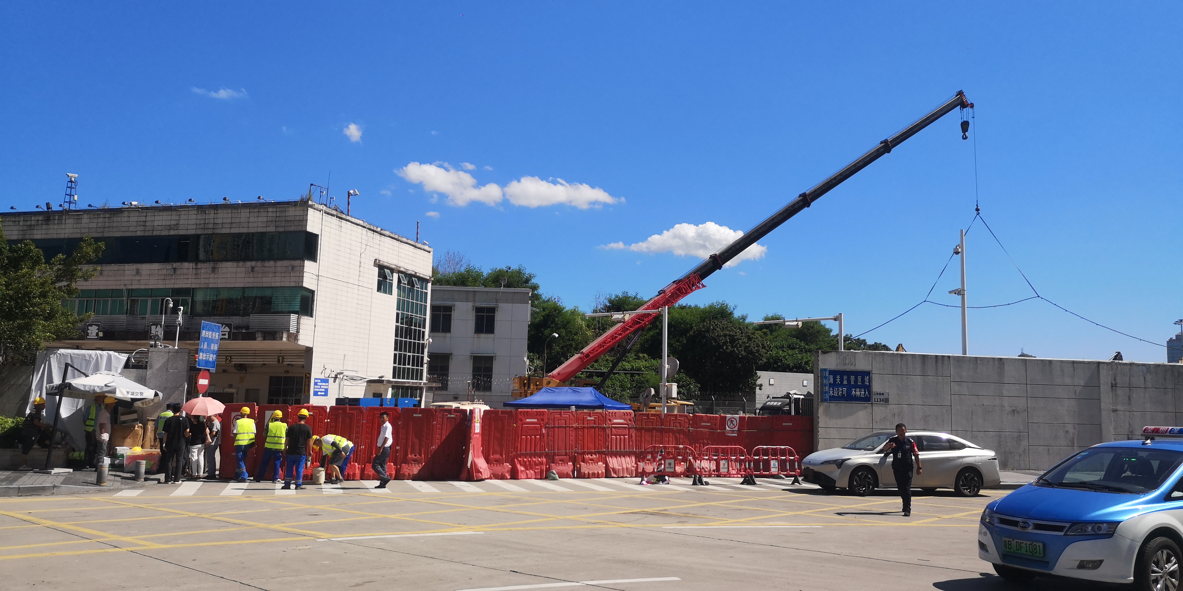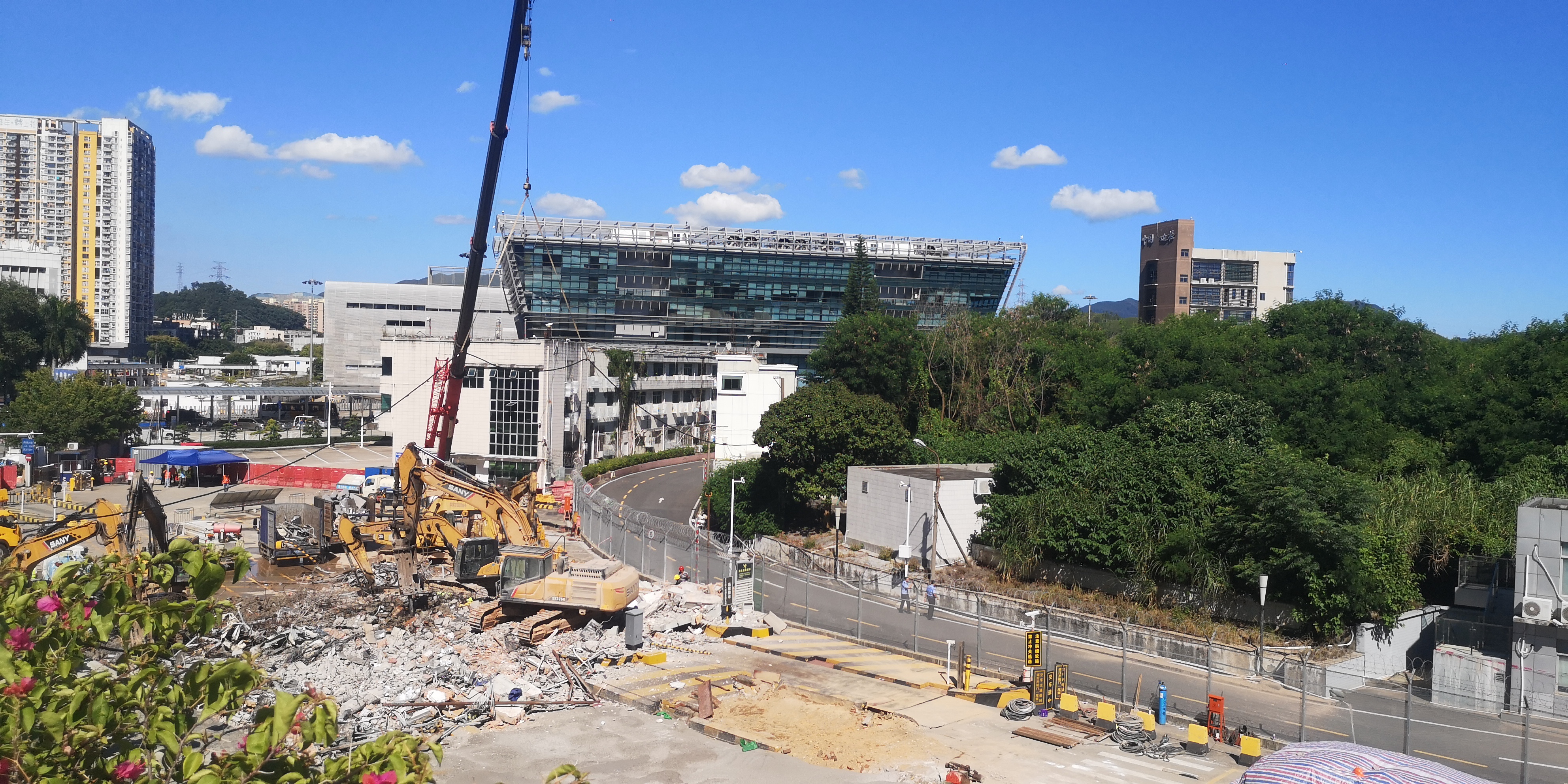 (大公文匯網記者石華、李昌鴻深圳報道)10日,記者趕到文錦渡口岸時,入境通道外圍已經用紅色圍欄隔開,多名保安在現場維持秩序,禁止無關人員靠近,在口岸附近有檢測人員在測量相關數據。從外圍看,一台吊臂掛起了三條鋼索。登上旁邊高架橋可以看到整個施工現場:多輛挖掘機在現場工作,沉降處布滿碎石和鋼筋。