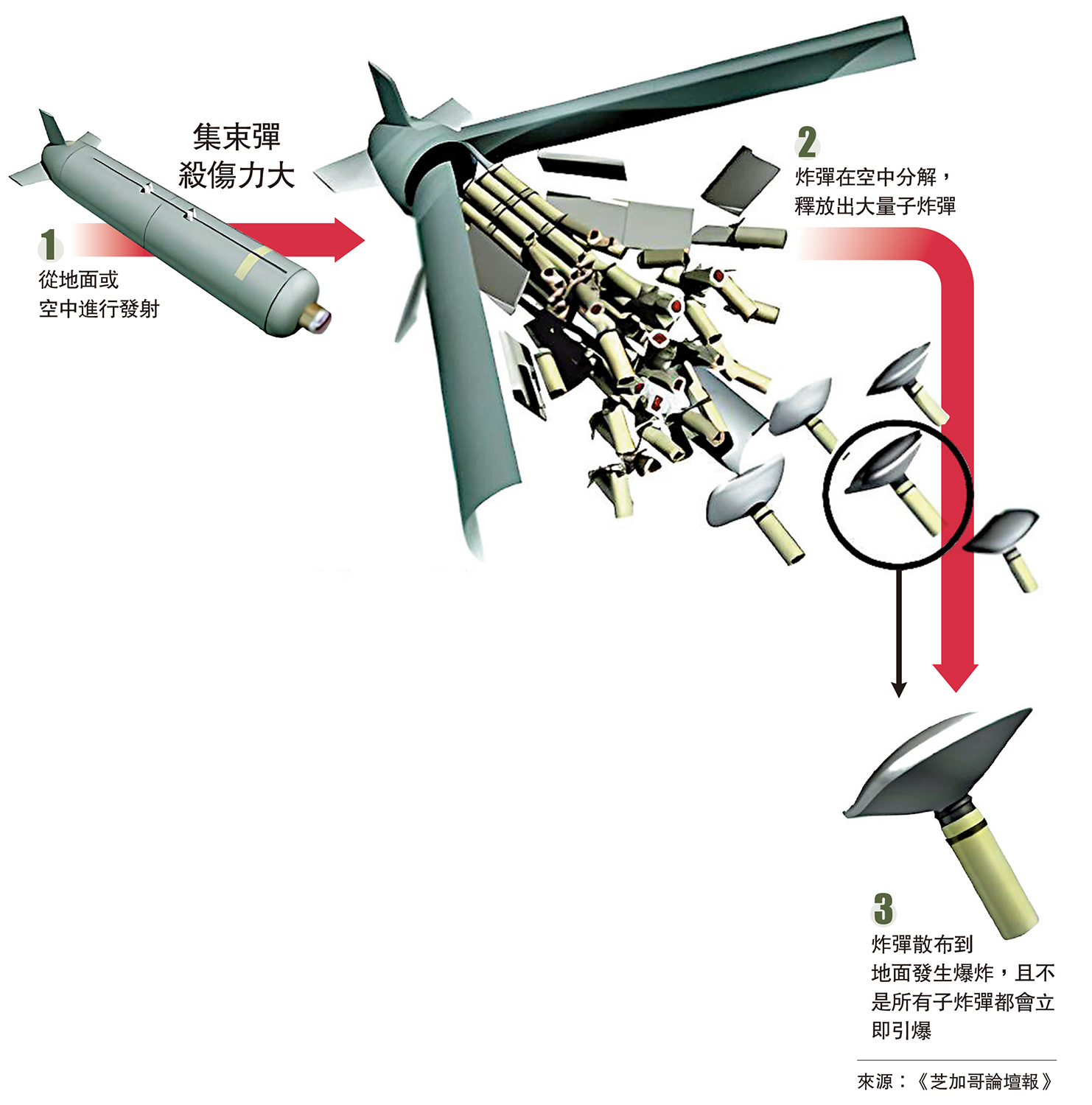 集束彈又稱子母彈,是將多個較細小的炸彈集合成一枚空用炸彈、炮彈或導彈彈頭的特種彈藥,當投射到目標區域時,彈體內的子炸彈便會散開,可以同時攻擊多個目標,極易傷及無辜。集束彈的子炸彈存在一定的啞彈率,落在地面後成為未爆彈。它們可能在被撿起或踩踏時爆炸,導致無辜平民,尤其是兒童死亡或殘廢。