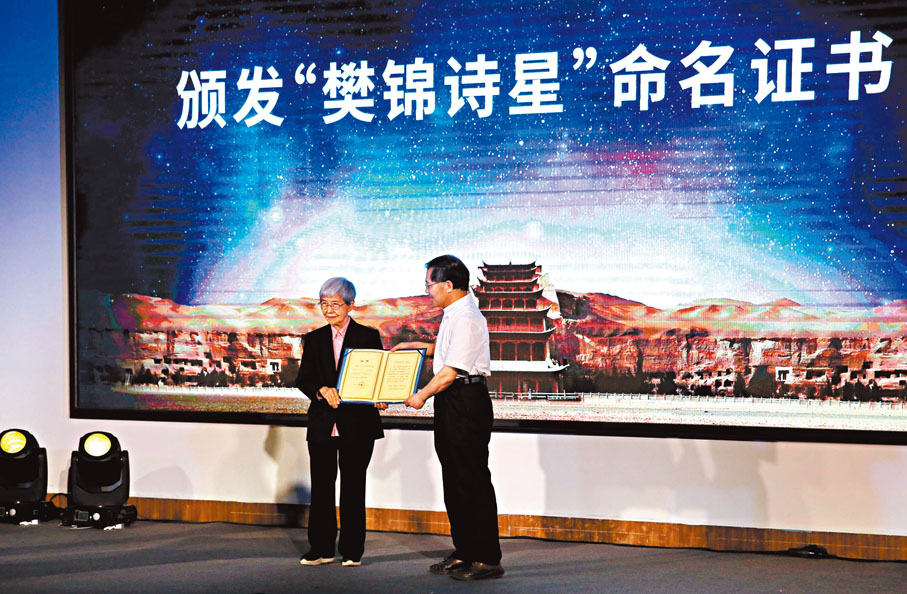 (香港文匯報 記者 郭濤 甘肅敦煌報道)擇一事,終一生;心歸處,是敦煌。 「這算是自己對敦煌事業,對推動全社會全方位助力敦煌研究院「典範」「高地」建設,再做一點力所能及的工作。」10日,在敦煌研究院舉辦「樊錦詩星」命名、樊錦詩基金設立暨樊錦詩從事敦煌文物工作60年座談會上,被譽為「敦煌女兒」的樊錦詩這樣說。繼向北京大學捐資1,000萬元(人民幣,下同)支持敦煌學研究後,樊錦詩再向中國敦煌石窟保護研究基金會捐資1,000萬元,成立「樊錦詩基金」用於敦煌文物事業發展。當天的活動由甘肅省人民政府、國家文物局、中央文史研究館、何梁何利基金會和中科院紫金山天文台共同舉辦。