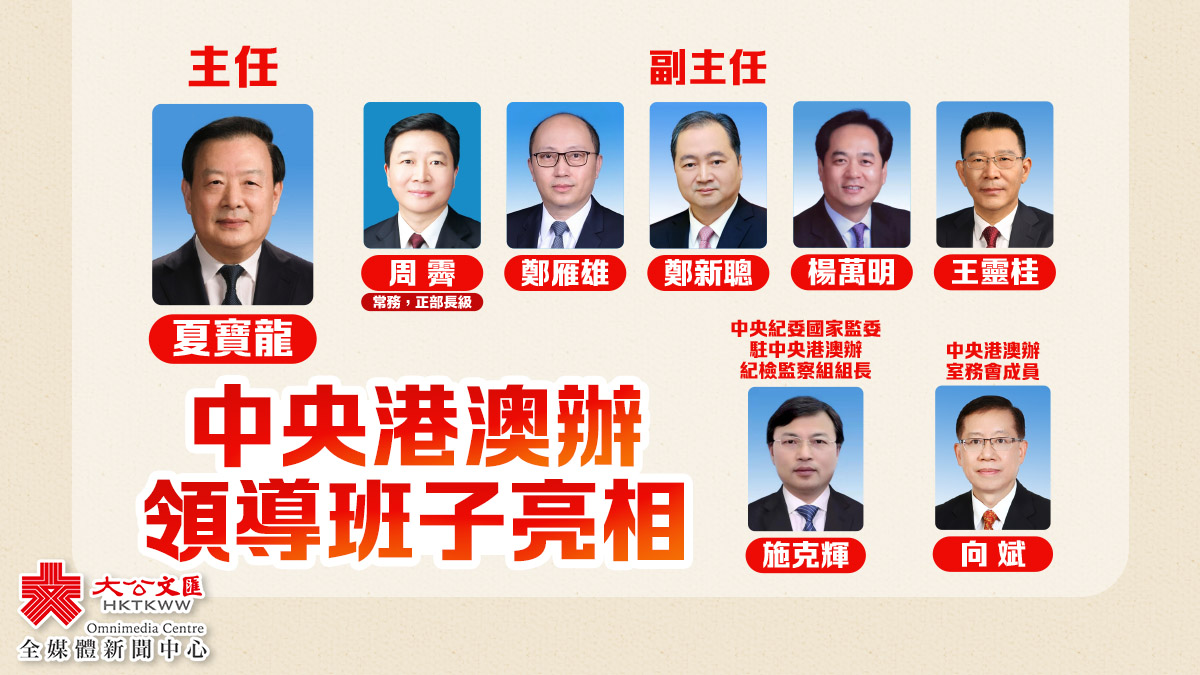 這是中共中央港澳工作辦公室(中央港澳辦)領導班子首次公開亮相,中央港澳辦主任是夏寶龍,副主任有五位,分別是周霽(常務,正部長級)、鄭雁雄、鄭新聰、楊萬明、王靈桂。