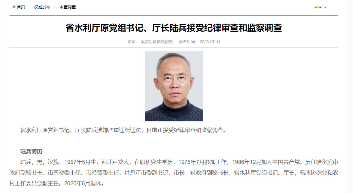據黑龍江省紀委監委消息,黑龍江省水利廳原黨組書記、廳長陸兵涉嫌嚴重違紀違法,目前正接受紀律審查和監察調查。