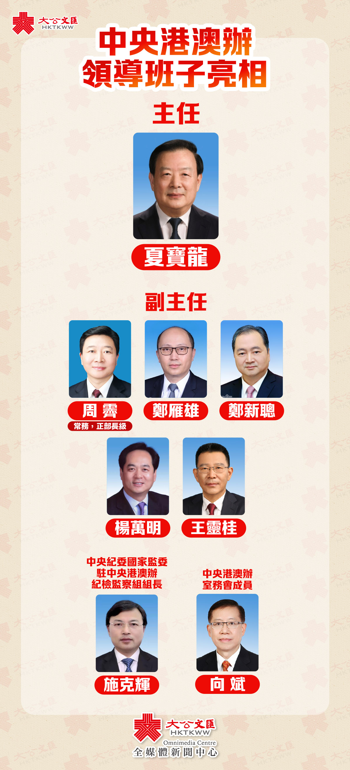這是中共中央港澳工作辦公室(中央港澳辦)領導班子首次公開亮相,中央港澳辦主任是夏寶龍,副主任有五位,分別是周霽(常務,正部長級)、鄭雁雄、鄭新聰、楊萬明、王靈桂。