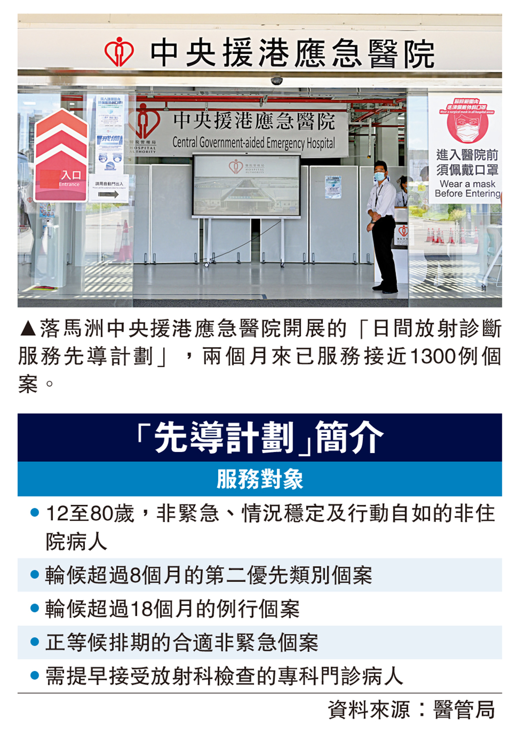在公立醫院進行電腦掃描、磁力共振等放射科檢查,非緊急病人隨時要等候十多個月。先導計劃於今年4月底開展,邀請非緊急、情況穩定和行動自如的非住院病人,轉往落馬洲中央援港應急醫院接受放射診斷服務,初期主要服務新界東醫院聯網轉介的病人,5月中擴至新界西聯網。