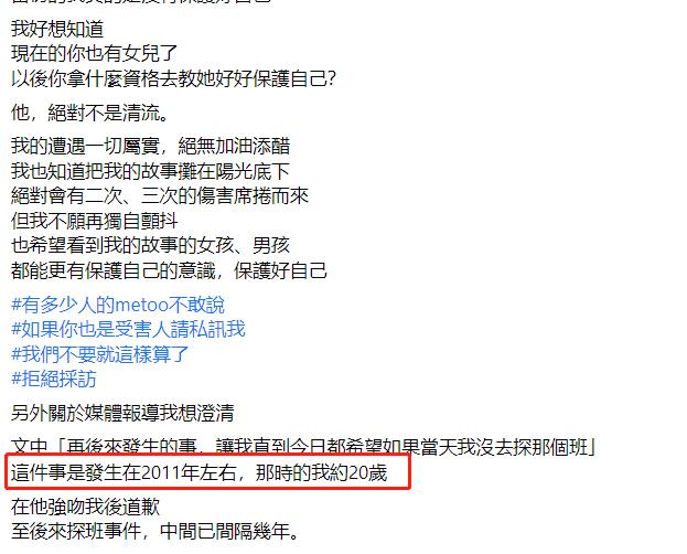 一名女網民上月發長文指控,稱自己17歲時遭演藝圈前輩強吻、還被對方拍裸照,她害怕又後悔流淚時,對方卻說「你流淚的時候也很美」。該網民憤怒批「我好想知道,現在的你也有女兒了,以後你拿什麼資格去教她好好保護自己?」發文不久後,該網民於臉書澄清,遭黃子佼拍攝裸照時為年滿20歲的成年人。