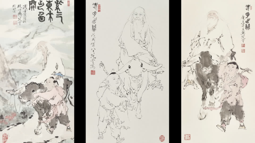 道家學派創始人老子是范曾最崇拜的先賢之一,這位兩千多年前的大思想家在范曾筆下形神兼備、栩栩如生。歷代文人墨客都有畫老子的,但范曾先生稱:「而我畫的老子,是范曾理解的老子。在中國哲學裏感到一切都是過程。一切都瞬息,一切不會停留。我畫《老子出關》的時候這些思想就在心裏浮動。因此我畫的老子有很多虛無縹緲的地方。」