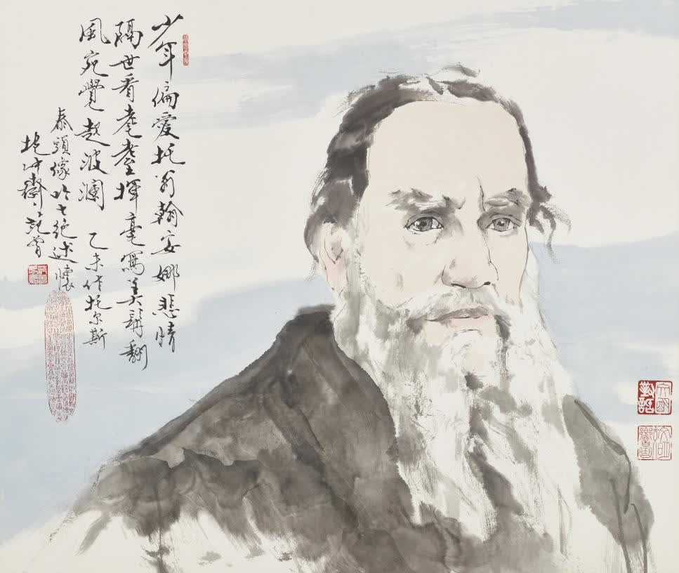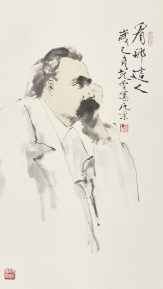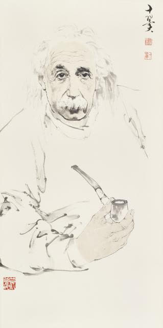 德國哲學家尼採在范曾筆下既有童心,又充滿智慧,眼神裏還有點「神經質」。畫科學家愛因斯坦,范曾稱:「我從他左邊的眼珠開始畫,畫完左邊眼珠畫右邊眼珠。兩個眼睛的距離當然一點都不能差。然後畫鼻子,兩個口角,鼻唇溝要畫出來。這要高度的寫實技巧和白描的功底,因為毛筆是不能改的。」