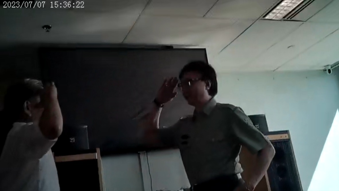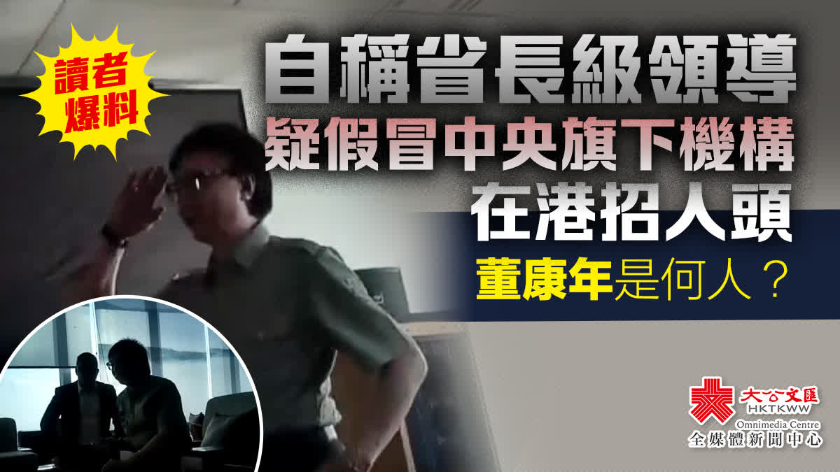 大公文匯全媒體記者日前經中間人介紹,成功到訪董康年的辦公室,一入大門,左側掛有「中共中央黨校(國家行政學院)旗下機構領高紅承教育籌委會駐港辦事處」的「水牌」,董康年更身穿軍服與訪客見面。