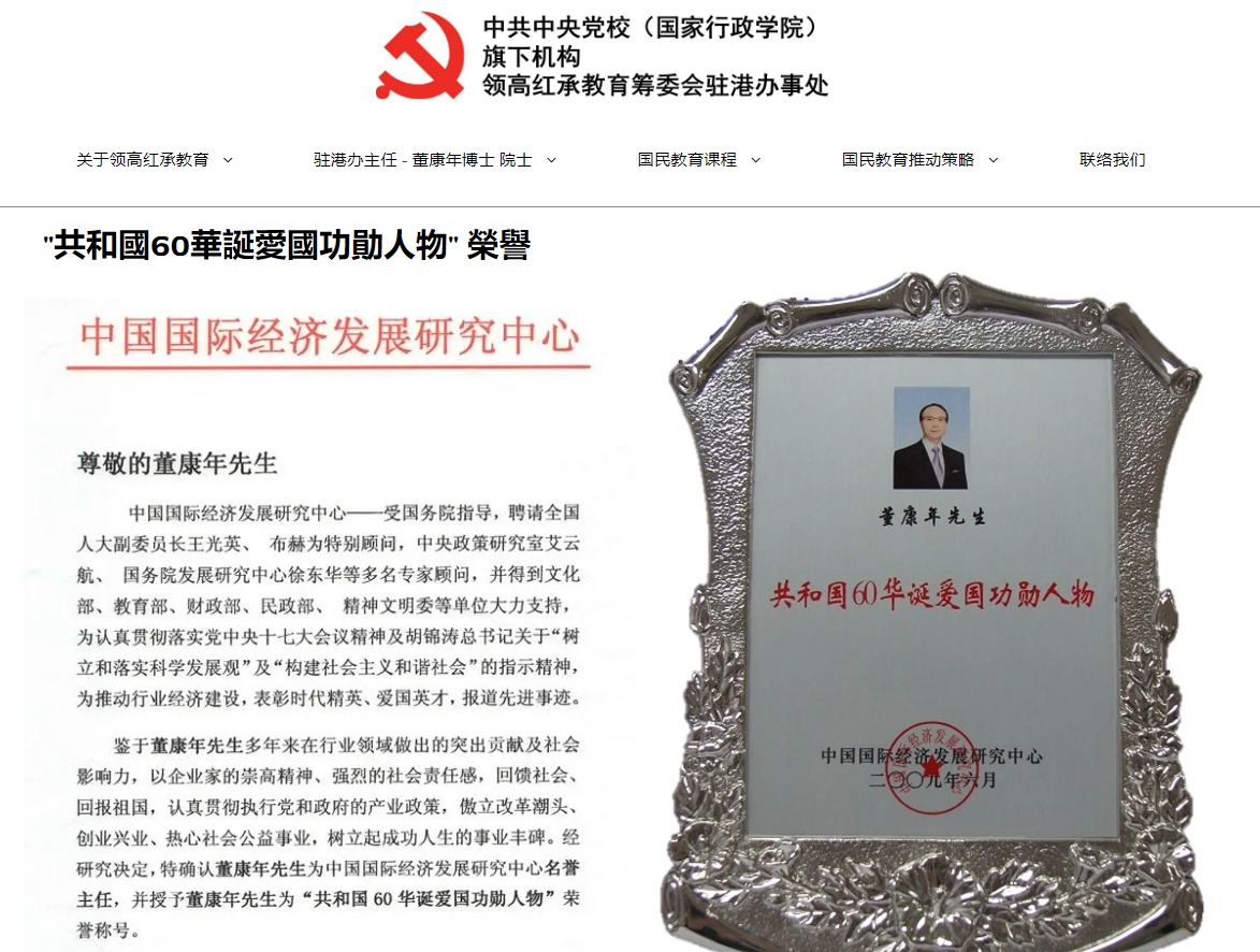 該網站又提到,董康年獲得「中國國際經濟發展研究中心」授予的「共和國60華誕愛國功勛人物」榮譽和名譽主任。記者發現到疑似「中國國際經濟發展研究中心」的網站,聲稱該中心於2002年中華人民共和國香港特別行政區「首席行政長官」簽署行政令的形式頒布成立,是按照中華人民共和國組織法組建的「非贏利性」國際專業組織,隸屬於「中國國際發展研究促進會」。暫時未知該中心和董康年的關係。