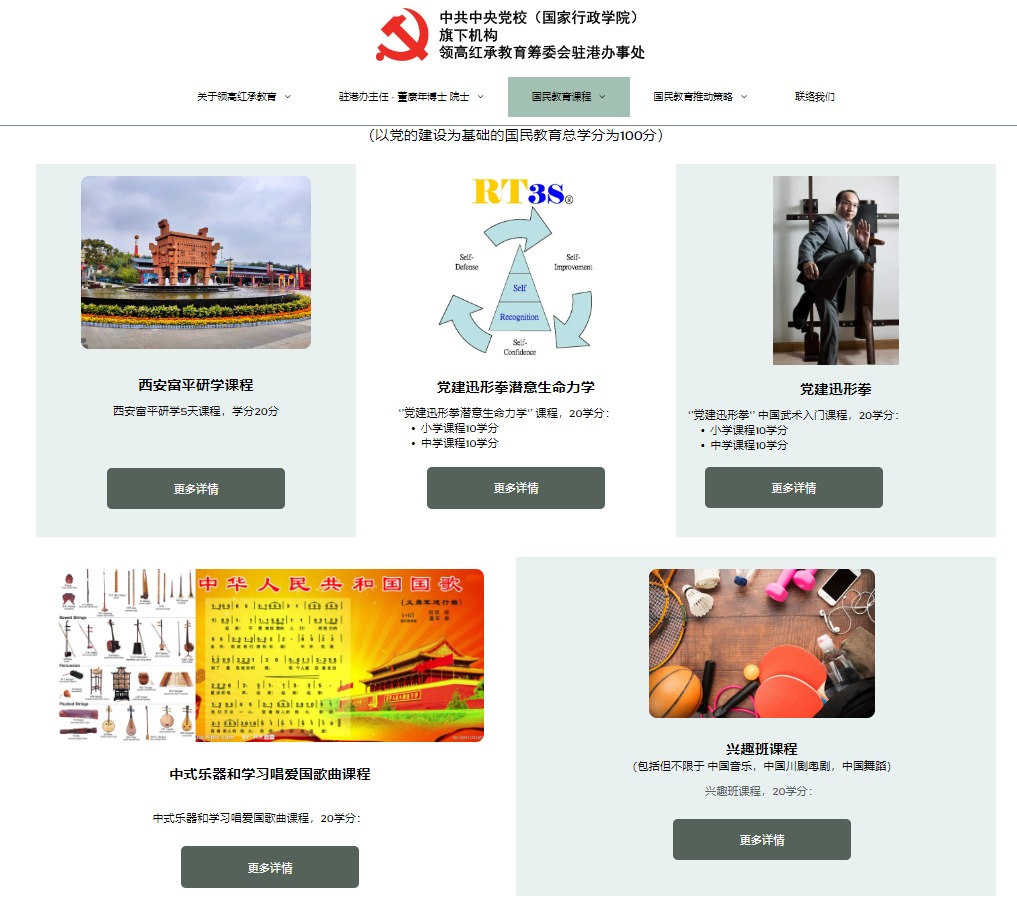 「領高紅承教育」網站上有關課程教育方面的介紹稱,提供以黨的建設為基礎的國民教育,總學分為100分,包括西安研學5天、黨建迅形拳潛意生命力學、黨建迅形拳中國武術入門,中式樂器和學習唱愛國歌曲和興趣班五大課程,每個各佔20學分。
