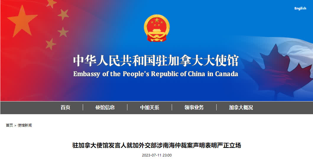 據中國駐加拿大大使館消息,7月11日,加拿大外交部就所謂南海仲裁案裁決7周年發表聲明,對中方在涉海問題上的正當合法立場說三道四,對中方相關海上執法活動攻擊抹黑。中方對此強烈不滿、堅決反對。