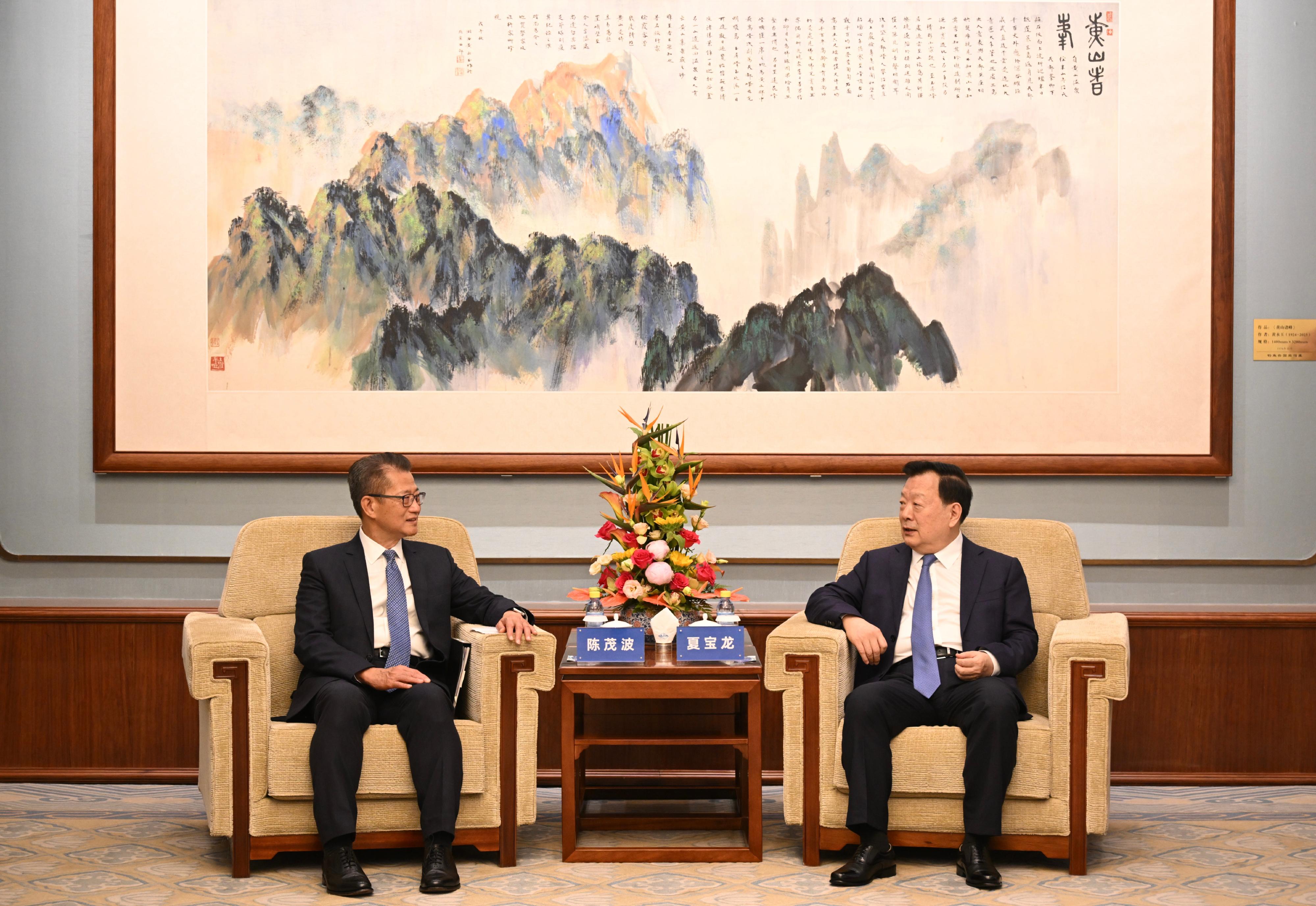 大公文匯全媒體報道,財政司司長陳茂波今日(12日)繼續訪京行程。早上,陳茂波獲國務院港澳事務辦公室主任夏寶龍接見。陳茂波向夏寶龍主任詳細匯報了香港最新的經濟和民生情況,以及在鞏固和提升國際金融中心地位的策略和工作,包括進一步深化互聯互通、推動資產管理業務的發展、促進普惠金融等,以及在今年下半年將舉行的大型國際會議的籌備進展。