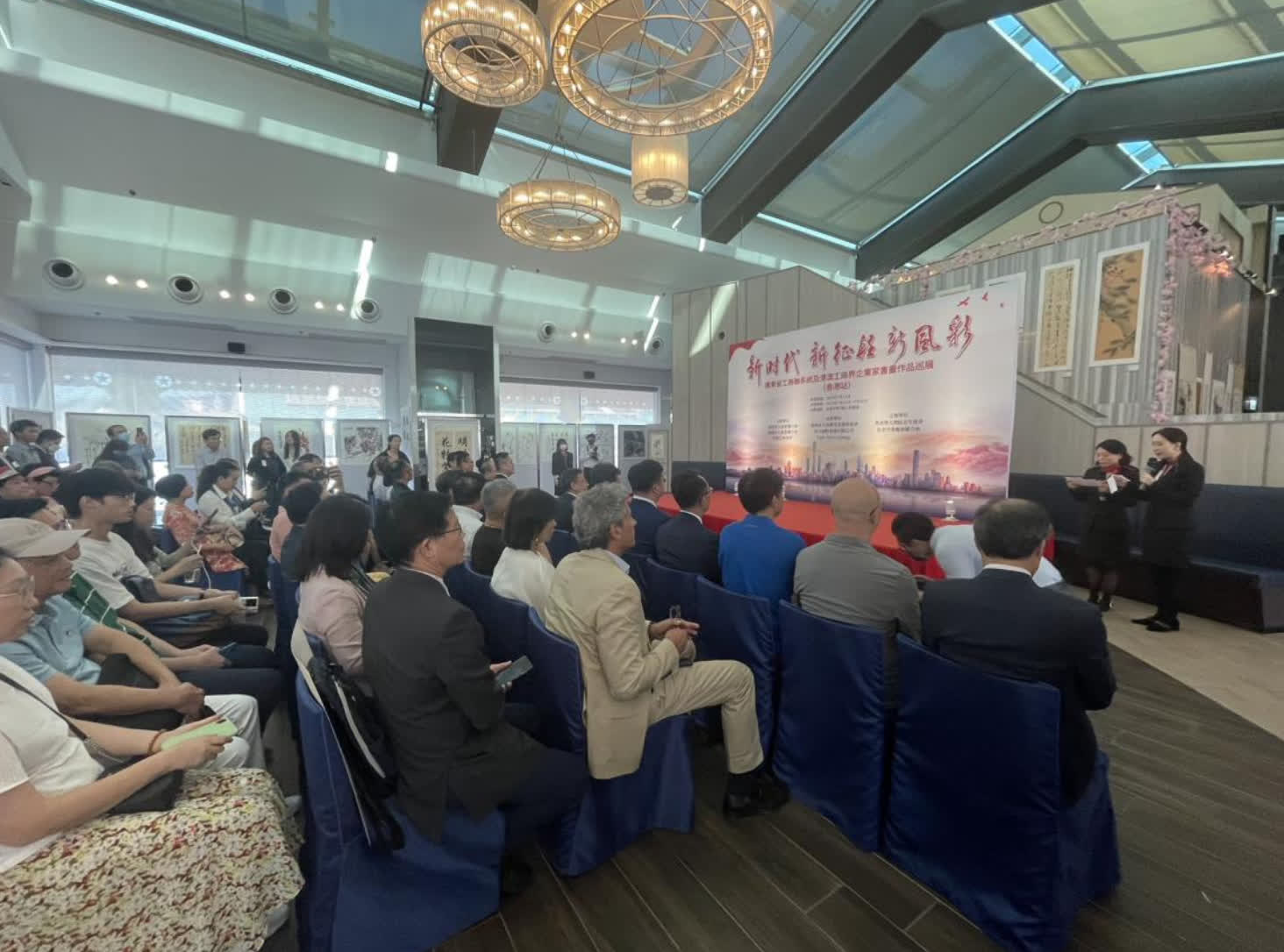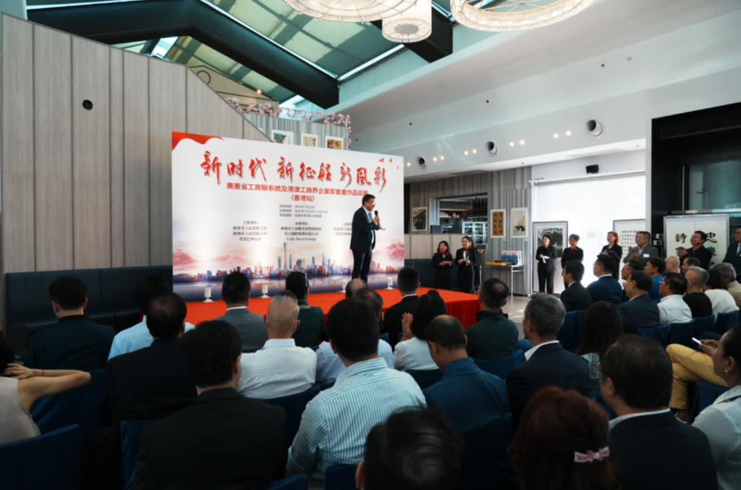 本次活動由廣東省工商聯、廣州市工商聯、香港巴林商會主辦,廣州市工商聯書畫藝術協會、其士集團和 Cafe Deco Group 承辦,粵港澳大灣區青年總會、香港中華廠商聯合會合辦。廣東省工商聯黨組成員唐小兵,廣州市工商聯副主席餘劍春,香港特別行政區政府商務及經濟發展局副局長陳百里博士,香港巴林商會會長周維正,香港中華廠商聯合會會長史立德、粵港澳大灣區青年總會副主席洪定安、廣州市工商聯書畫藝術協會會長劉奕、香港其士國際集團有限公司副董事總經理譚國榮共同主禮,全國政協委員凌俊傑、香港中國商會創會會長陳丹丹、香港新界廠商聯合會會長梁立人、香港順德聯誼總會會長盧浩宏、廣東外商公會名譽會長朱穎恆、香港清遠友好協進會主席何毅強、香港東方書畫院院長梁君度、香港東方書畫院執行院長葉永潤、粵港澳大灣區青年總會副主席兼青研香港召集人陳志豪等出席開幕式。