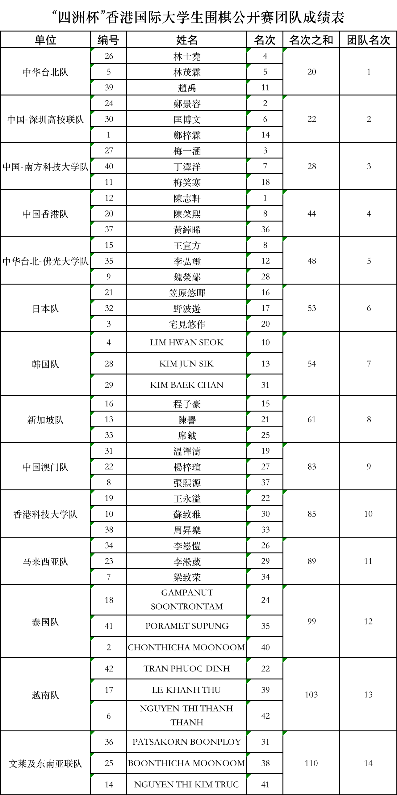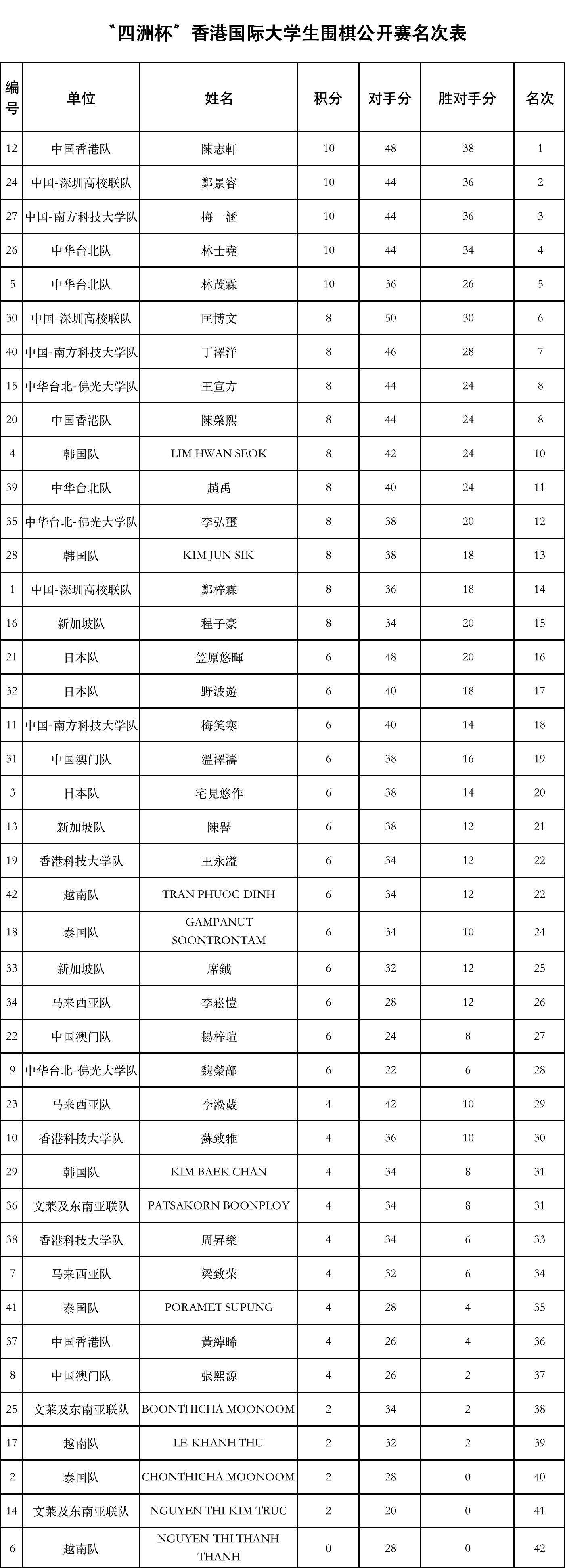7月12日,經過2天6輪的緊張比拚,「四洲杯」香港國際大學生圍棋公開賽比賽對局全部結束。最終中國香港隊陳志軒以5勝1負的成績奪冠。深圳高校聯隊鄭景容與南方科技大學隊梅一涵大分小分完全相同,最終通過抽籤,鄭景容幸運的排名第2,梅一涵屈居第3。團體方面由林士堯、林茂霖、趙禹組成的中華台北隊奪得冠軍,深圳高校聯隊與南方科技大學隊分獲二三名。
