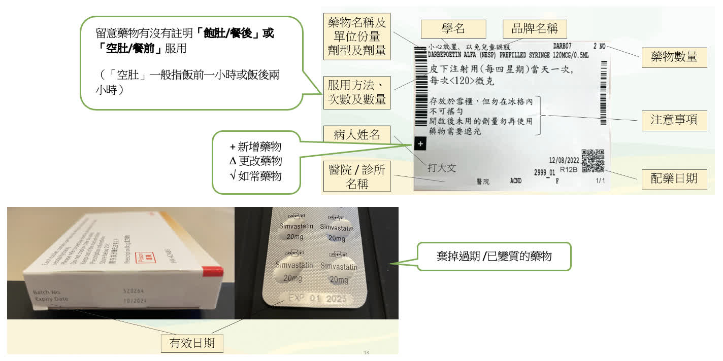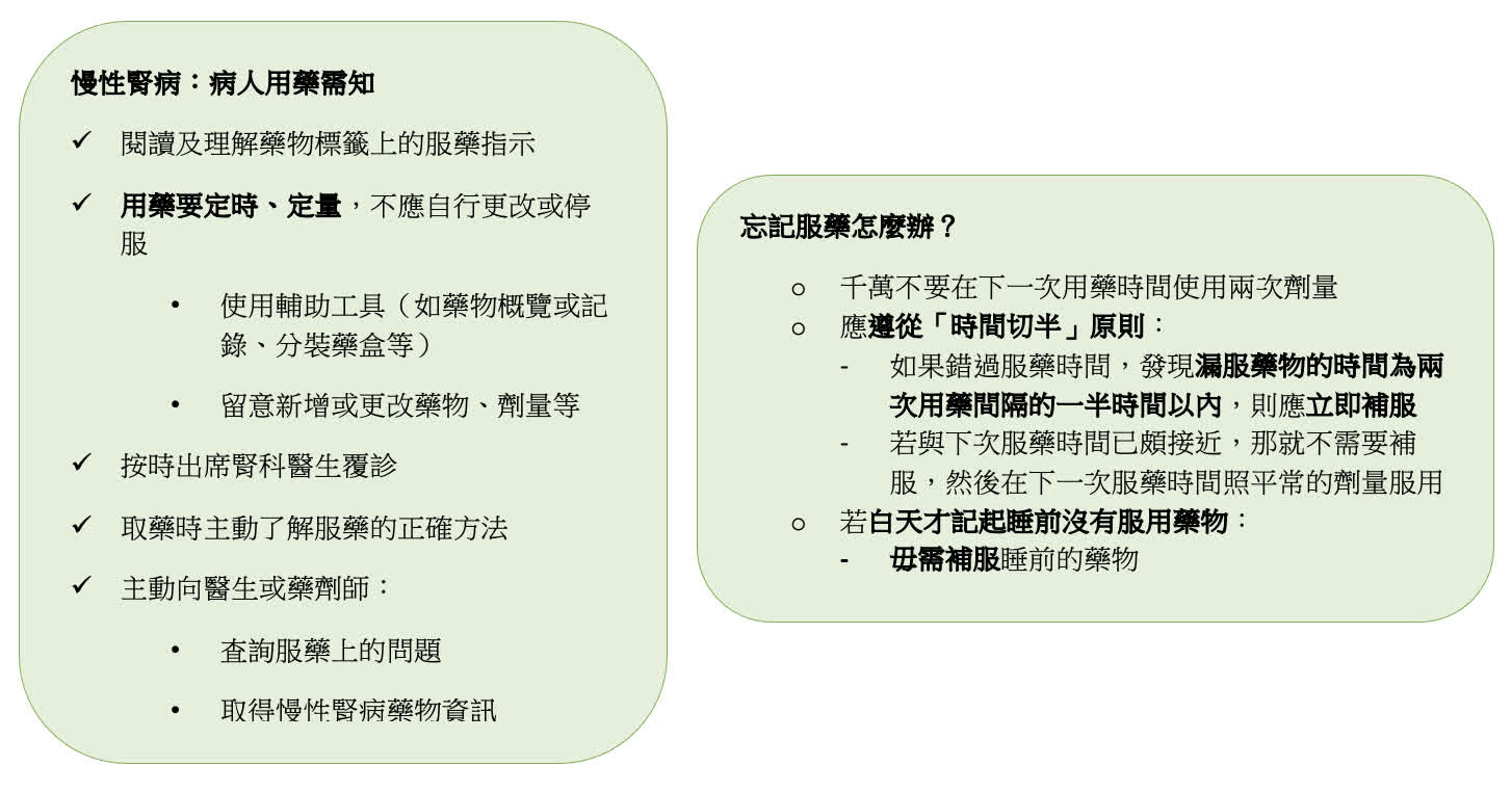 腎病病友通常都要服用多種藥物,經常會導致藥物不良反應、藥物相沖、忘記或錯誤服藥等問題,有時侯,醫生亦可能處方額外藥物,處理其它藥物的副作用。為了避免用藥傷害,腎病病友除了要對藥物有基本的認識及學懂閱讀藥物標籤外,還要在覆診及取藥時,主動向醫生及藥劑師了解服藥的正確方法,並査詢服藥上的問題。